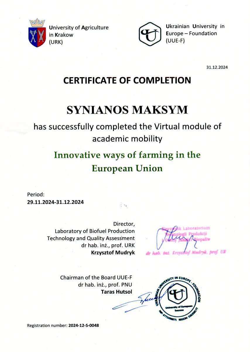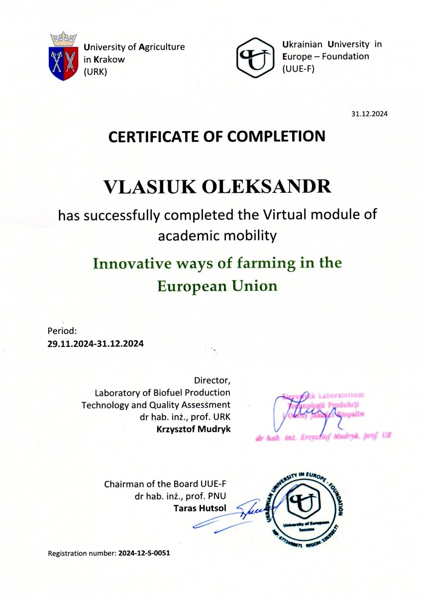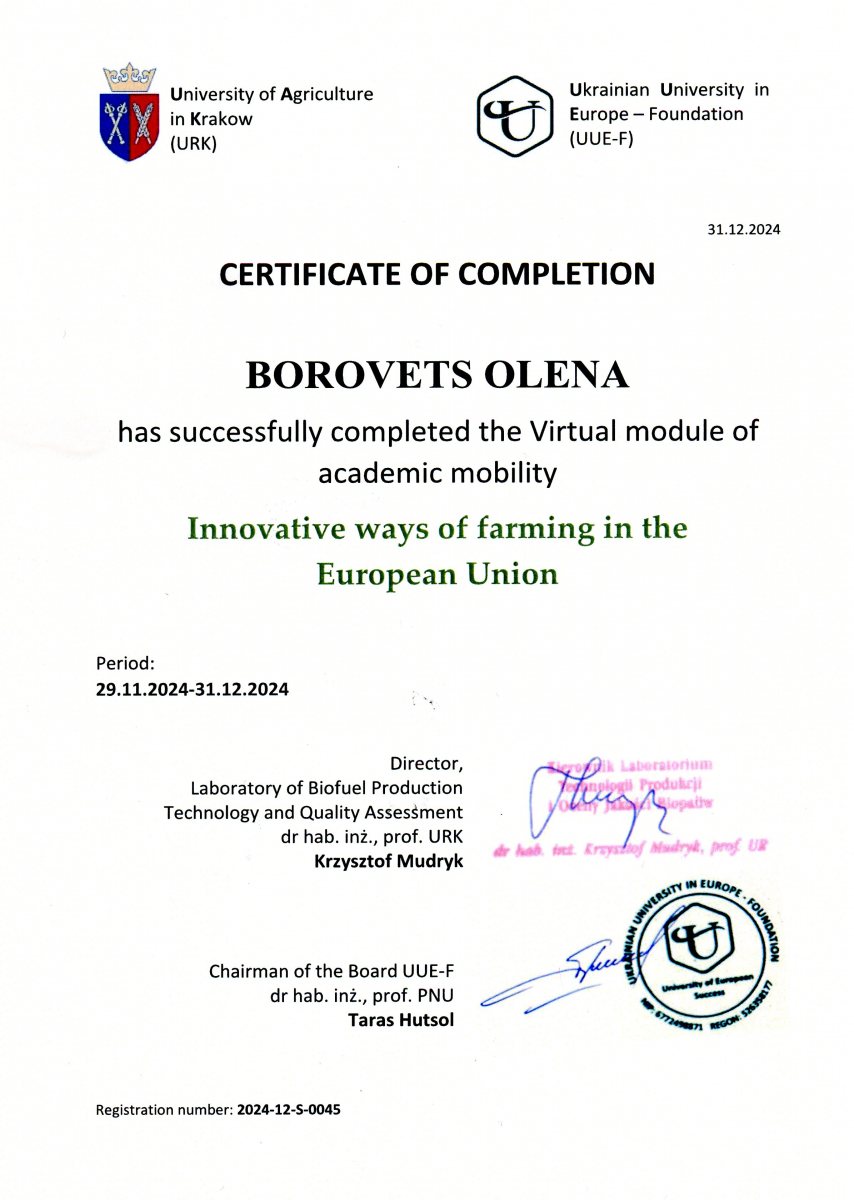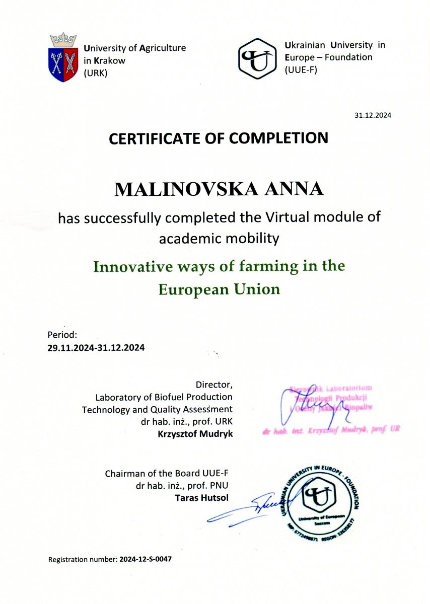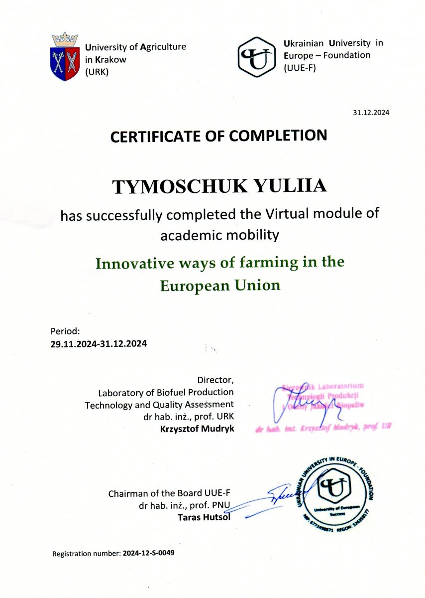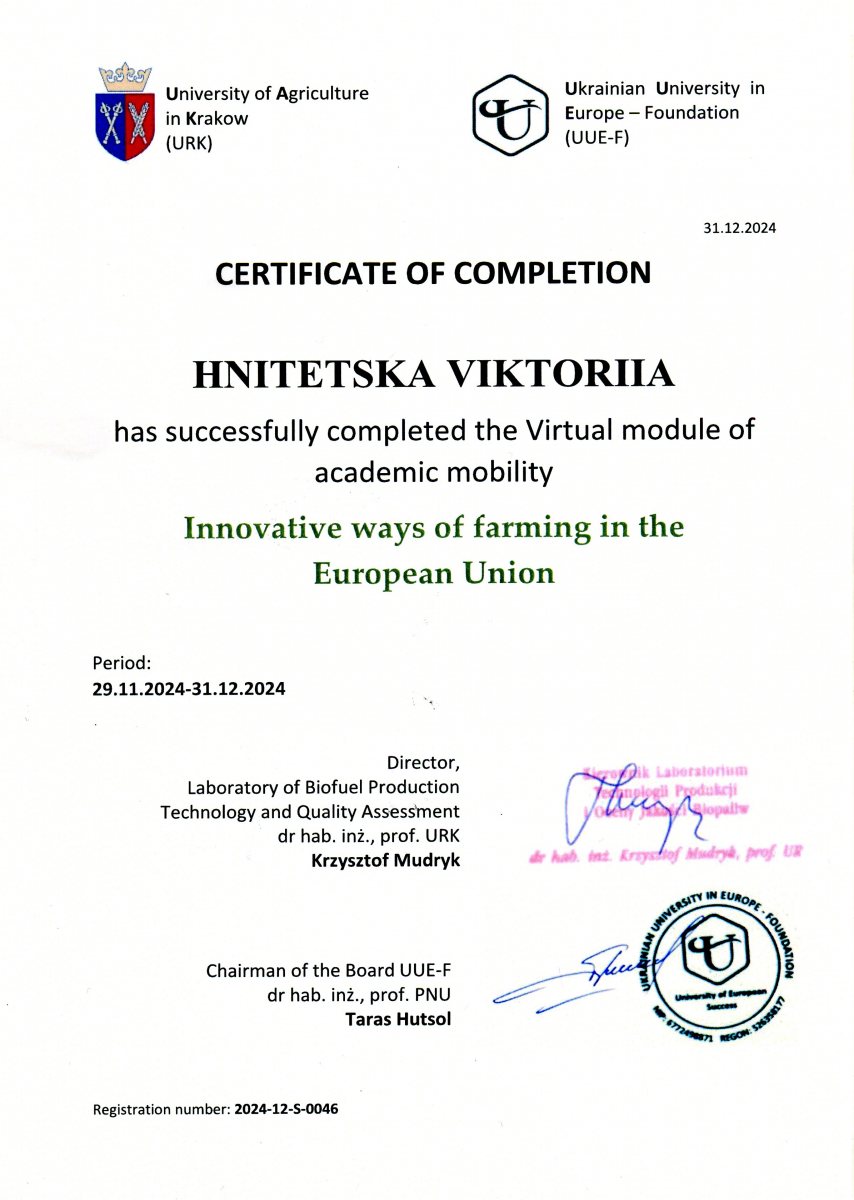 Здобувачі вищої освіти ОП «Захист і карантин рослин» у 2024 році прийняли участь у програмі міжнародної академічної мобільності «Innoovative ways of farming in the European Union» Сільськогосподарського університету ім. Гуго Коллонтая (URK) у м. Краків (Польща).