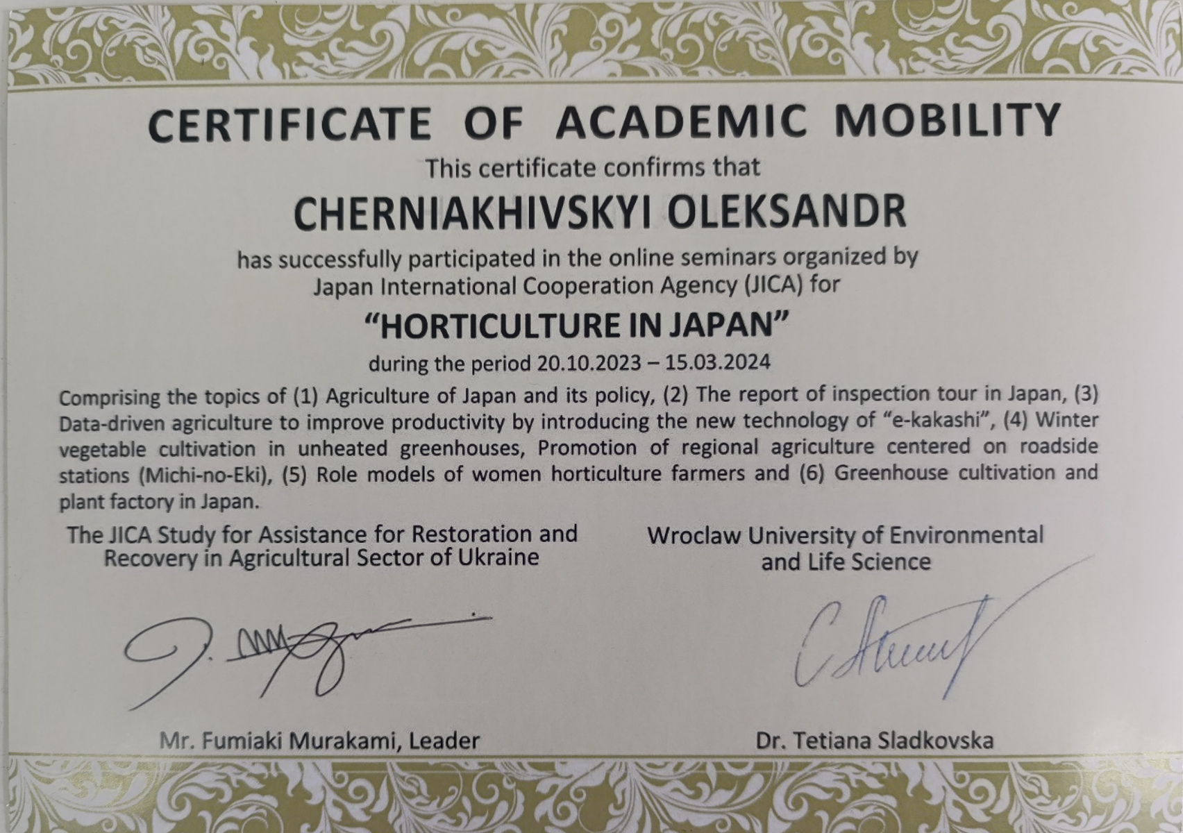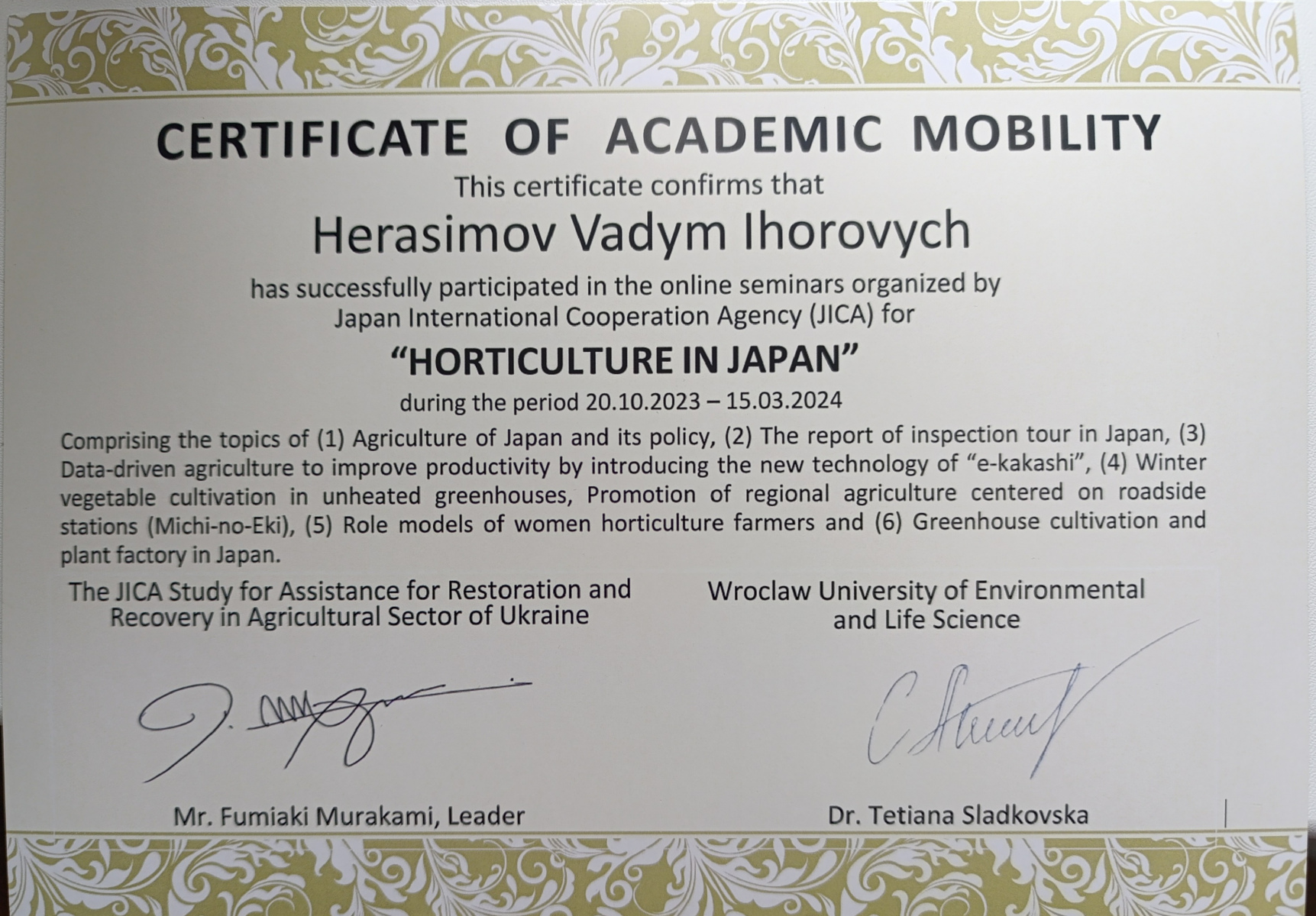 Протягом жовтня 2023 – березня 2024 р. студенти Вадим Герасимов та Олександр Черняхівський прийняли участь в онлайн-семінарах, організованих Японським агентством міжнародного співробітництва (JICA) за тематикою «Садівництво в Японії».