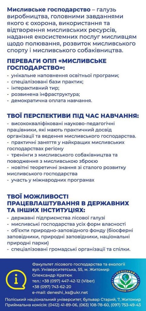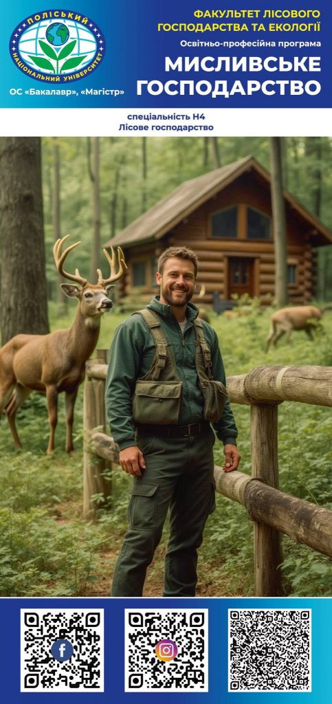 Мисливське господарство — це вибір для тих, хто хоче бути хранителем дикої природи. Ця спеціальність поєднує науку, практику й справжню відповідальність: облік та охорону тварин, відновлення популяцій, роботу в природних ландшафтах і управління мисливськими угіддями за європейськими стандартами. Це професія для сильних, свідомих і небайдужих — тих, хто не просто спостерігає за природою, а бере участь у її збереженні та розвитку.