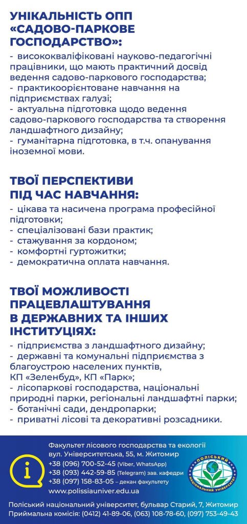 Садово-паркове господарство — це спеціальність для тих, хто хоче створювати красу й простір для життя. Тут поєднуються творчість, екологія та сучасний дизайн: від озеленення міст і приватних територій до відновлення парків і громадських просторів. Фахівці цієї галузі змінюють міста, роблять їх комфортнішими, зеленішими та здоровішими для людей. Обираючи садово-паркове господарство, ти обираєш професію, де твій результат видно одразу — у квітах, деревах і щасливих усмішках людей.