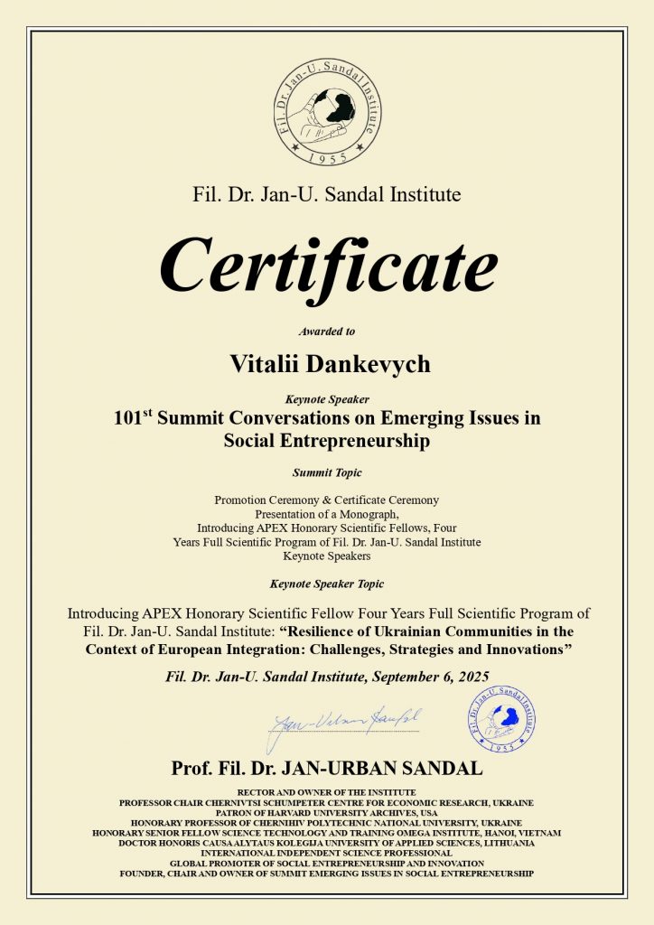 2025–2028 – APEX Scientific Fellow, Fil. Dr. Jan-U. Sandal Institute. Дослідницька тема: “Стійкість українських громад у контексті європейської інтеграції: виклики, стратегії та інновації (ResCom-EU)”.