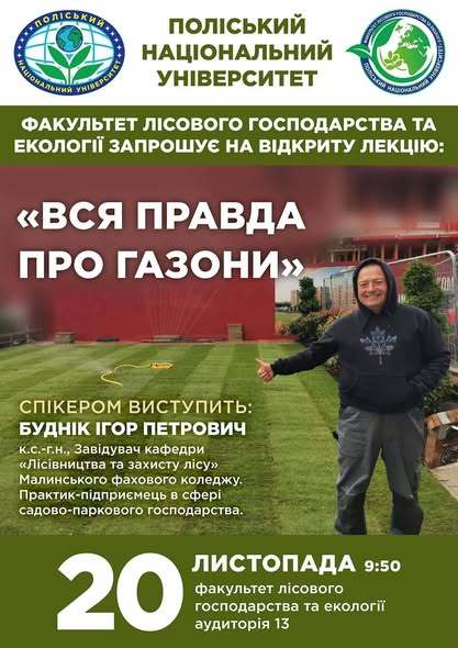 20 листопада для студентів спеціальності «Садово-паркове господарство» була проведена відкрита лекція «Вся правда про газони». Спікером виступив к.с.-г.н., завідувач кафедри лісівництва та захисту лісу Малинського фахового коледжу Буднік Ігор Петрович, який поділився практичними порадами щодо створення та догляду за газонами. Студенти отримали корисні професійні знання й змогли поставити запитання фахівцю-практику