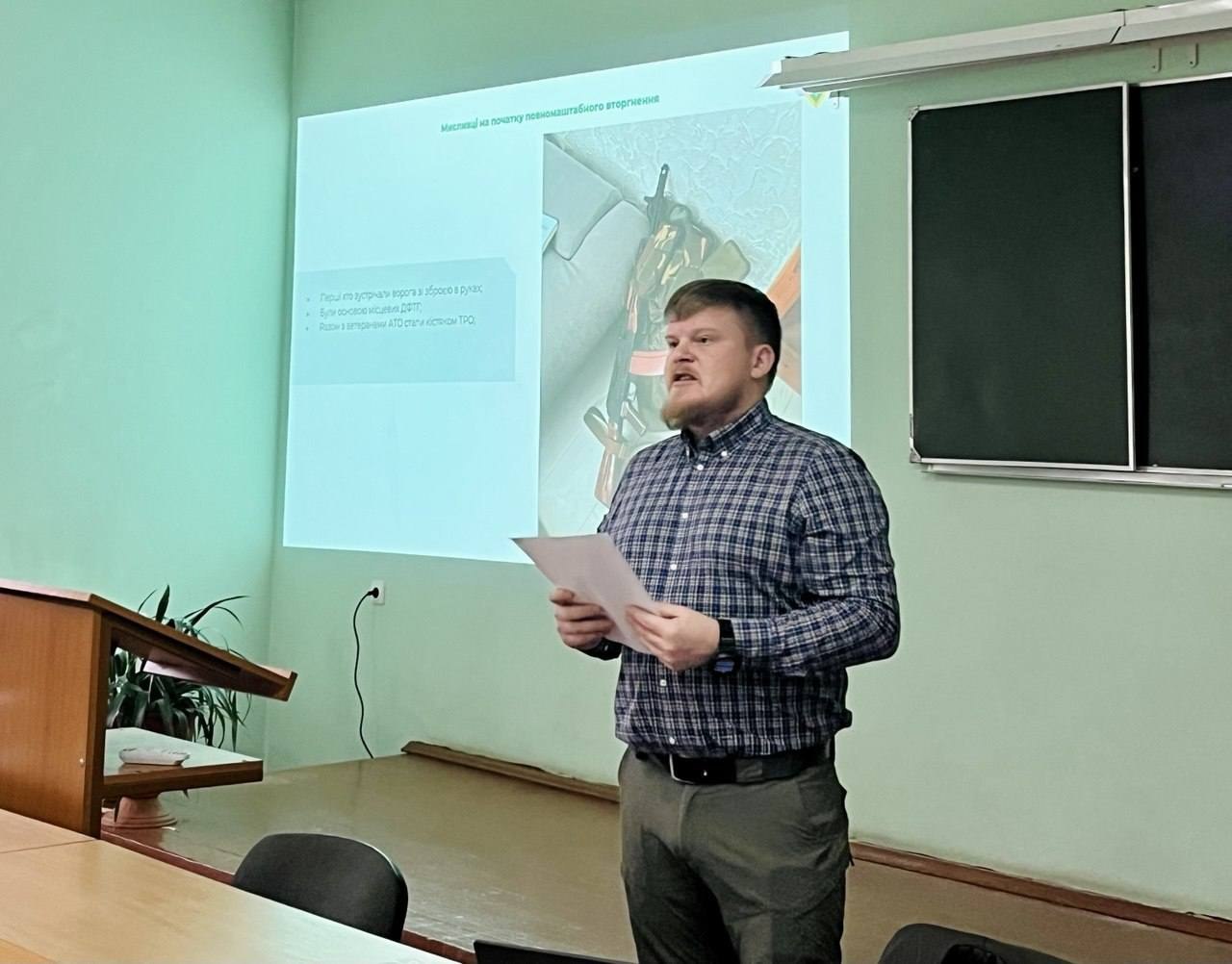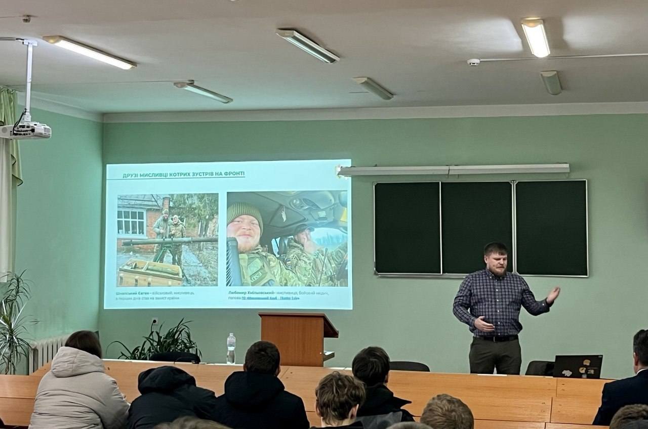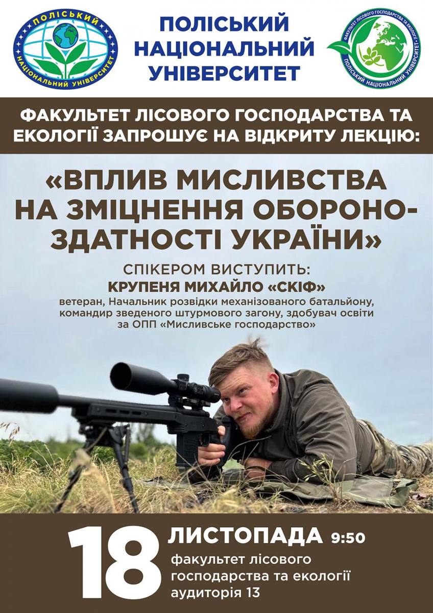 18 листопада 2025 року здобувачі освіти та викладачі факультету лісового господарства Поліського національного університету отримали унікальну можливість взяти участь у гостьовій лекції на тему: «Вклад мисливців у зміцнення обороноздатності України». Лекцію провів Михайло Крупеня, позивний «Скіф» – ветеран війни, начальник розвідки механізованого батальйону, командир зведеного штурмового загону та здобувач освіти за освітньо-професійною програмою «Мисливське господарство».