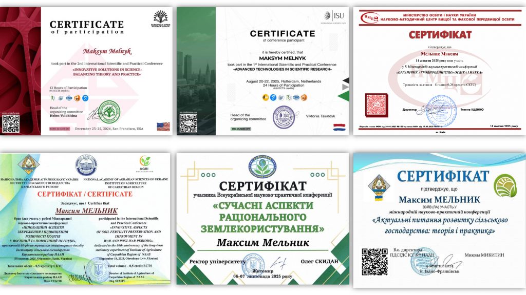 7. Сучасні аспекти раціонального землекористування : Всеукраїнська науково-практична конференція (м. Житомир, 06–07 листопада 2025), Житомир : Поліський національний університет. 2025.