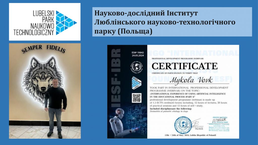 Вебінар «Internstional experience of using artificial intelligence in the educational process / Міжнародний досвід використання штучного інтелекту в освітньому процесі». Включена дисципліна: Дерматит паразитарної етіології у собак. | Польща, Інститут Науково-дослідного Люблінського науково-технологічного парку | 15.05.2024–24.05.2024 | навчання, сертифікат на 45 год |