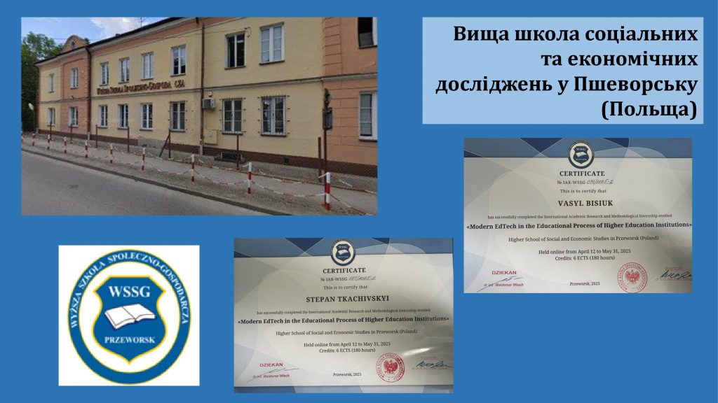 Міжнародне академічне науково-методичне стажування «Modern edtech in the educational process of higher education institutions/Сучасні освітні технології (EdTech) в освітньому процесі закладів вищої освіти» | Сертифікат № IAR-WSSG 096/2025-2 | 180 годин/6 кредитів | Польща, Вища школа соціальних та економічних досліджень у Пшеворську, 12.05.2025-31.05.2025