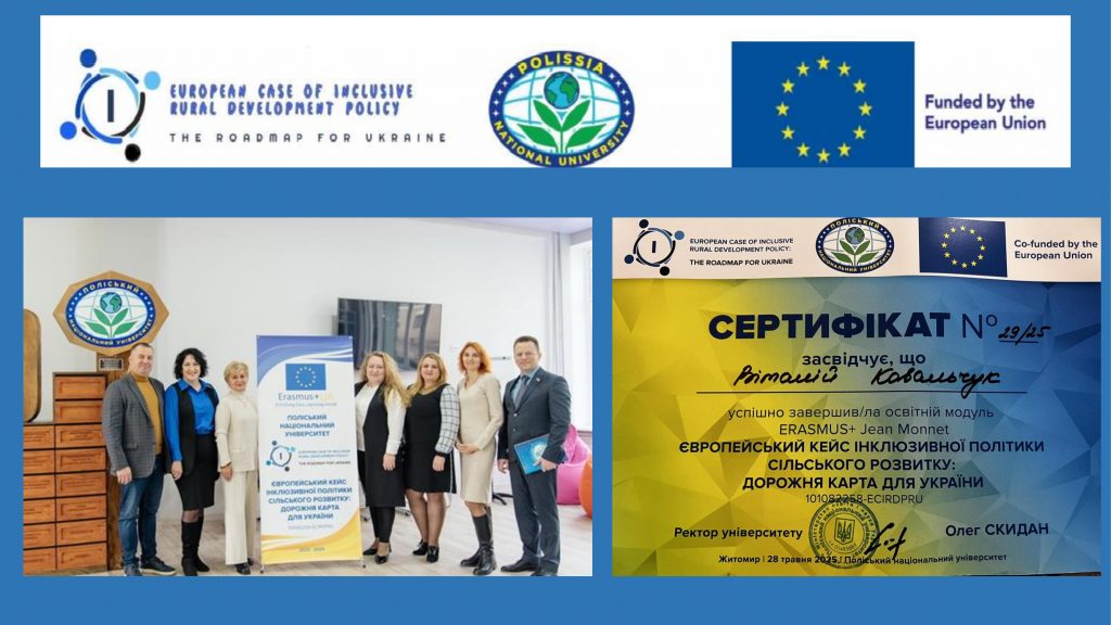 | 5. | Ковальчук Віталій Вікторович | Erasmus+ Jean Monnet Module: «Європейський кейс інклюзивної політики сільськогосподарського розвитку: дорожня карта для України» (№101082258–ECIRDPRU, 2022–2025) | Сертифікат