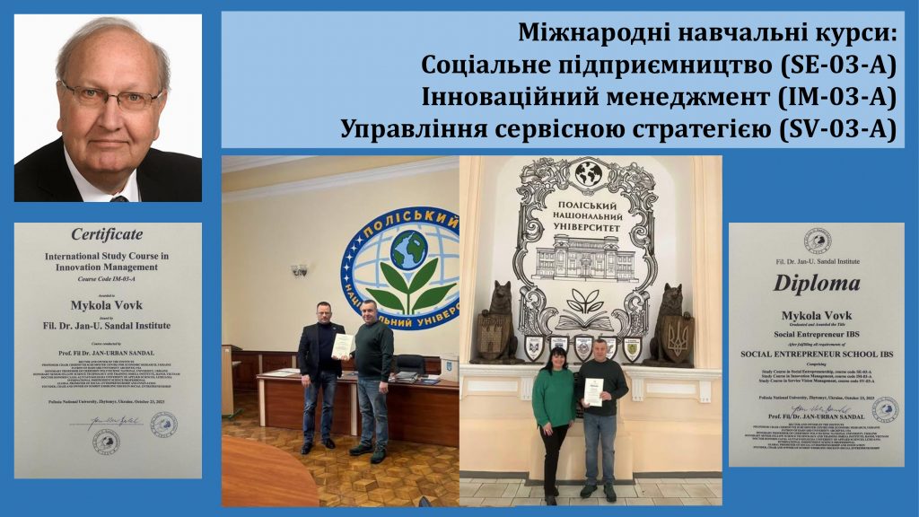 Міжнародний навчальний курс Study Course in Social Entrepreneurship/Соціальне підприємництво (SE-03-A) | Норвегія, Науковий Інститут д-ра Яна-У. Сандала, | 10.09.2023 – 23.10.2023 | навчання, сертифікат |