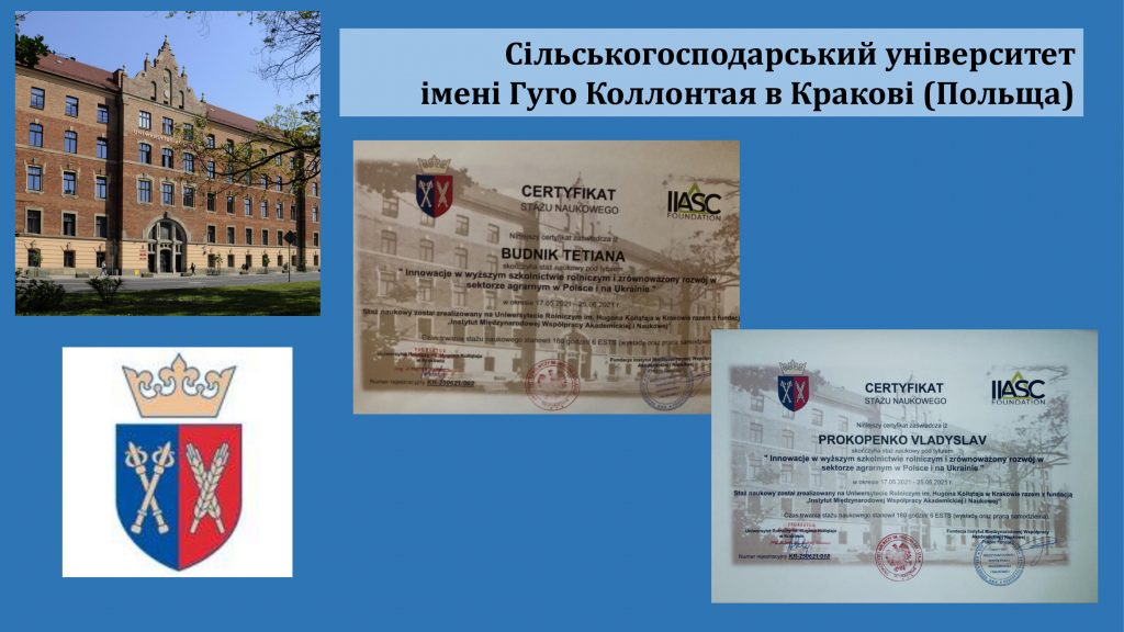 | 2. | Прокопенко Владислав Сергійович | Наукове стажування на тему «Innowacje w wyzszym szkolnictwie rolniczym i zrównowazony rozwoj w sektorze agrarnym w Polsce i na Ukrainie/Інновації у вищій аграрній освіті та сталий розвиток аграрного сектору в Польщі та Україні» | Сертифікат № KR- KR-250621/018 від 25.06.2021 р. | 180 годин/6 кредитів | Польща, Сільськогосподарському університеті імені Гуго Коллонтая в Кракові, 17.05.2021 – 25.06.2021 |