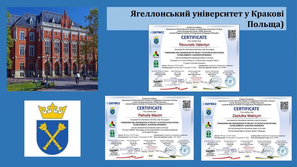 Міжнародне стажування за програмою підвищення кваліфікації «Fundraising and Organization of Project Activities in Educational Establishments: European Experience/ Фандрейзинг та організація проєктної діяльності в освітніх закладах: європейський досвід», під час якого розроблено навчальний проект на тему: «Екологічна безпека України: сучасні виклики» | Сертифікат № SZFL-003097 від 10.12.2023 | 180 годин/6 кредитів | Польща, Ягеллонський університет в Кракові,