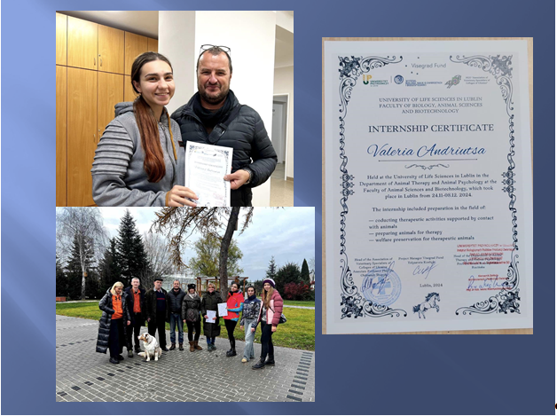 Зокрема, здобувачка ОПП «Ветеринарна медицина» Андріуца Валерія пройшла міжнародне стажування в університеті природничих наук у м. Люблін (Польща) (University of Life Sciences in Lublin (Poland), на кафедрі терапії тварин та зоопсихології (Department of Animal Therapy and Animal Psychology) з 24 листопада по 08 грудня 2024 року.