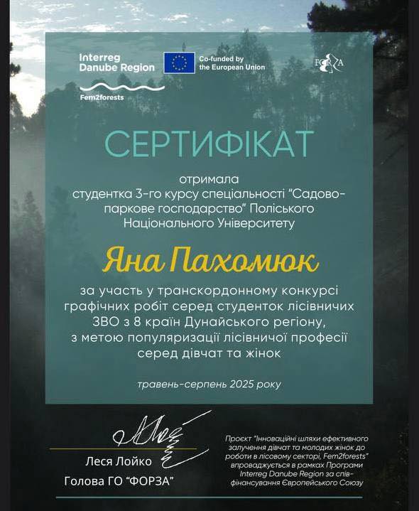 Студентка 3-го курсу Яна Пахомюк, яка навчається за спеціальністю «Садово-паркове господарство», взяла участь у транскордонному конкурсі графічних робіт. Конкурс проводився у травні–серпні 2025 року серед студенток лісівничих закладів вищої освіти з восьми країн Дунайського регіону з метою популяризації лісівничої професії серед дівчат та жінок. Цей сертифікат, виданий у межах проєкту «Fem2forests» за підтримки програми Interreg Danube Region та Європейського Союзу.