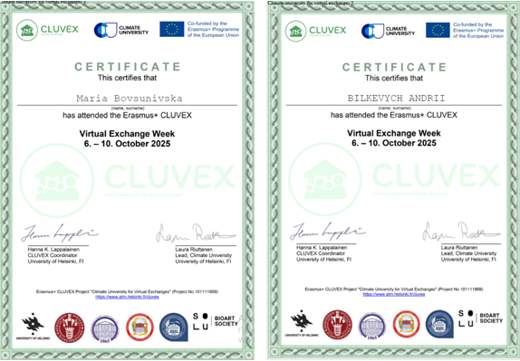 У жовтні 2025 рок двоє студентів Бовсунівська Марія і Бількевич Андрій пройшли курс “Climate university for virtual exchanges” the Erasmus+ CLUVEX (Гельсінкі, Фінляндія).