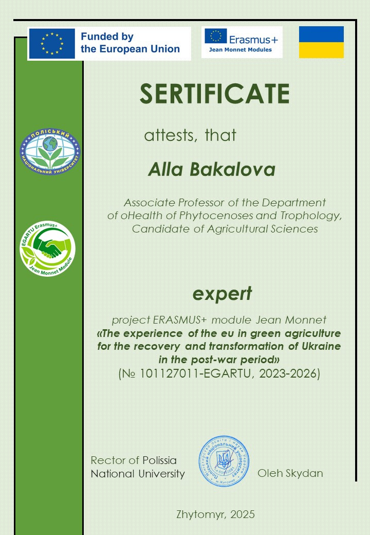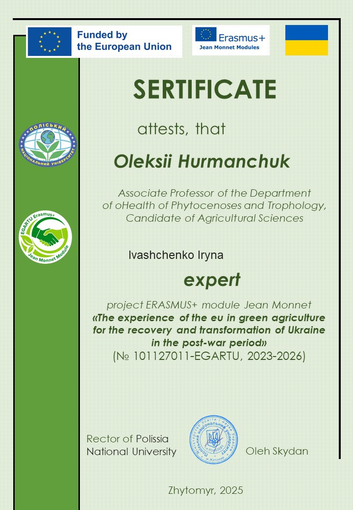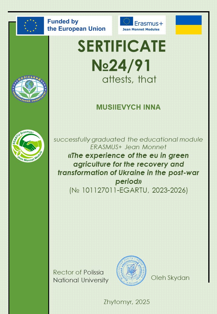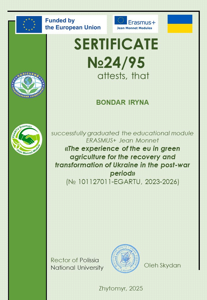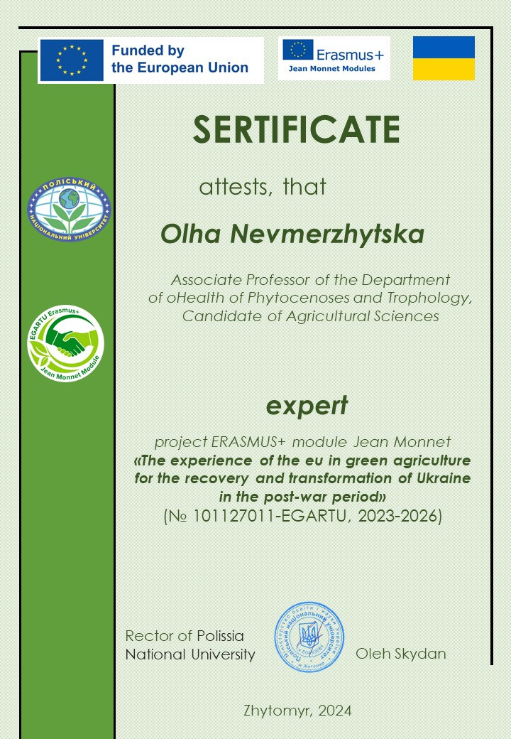 Здобувачі вищої освіти ОП «Захист і карантин рослин» у 2024 та 2025 рр. пройшли навчання з освітнього модулю ERASMUS+ Jean Monnet «Досвід ЄС у зеленому сільському господарстві для відновлення та трансформації України у повоєнний період».