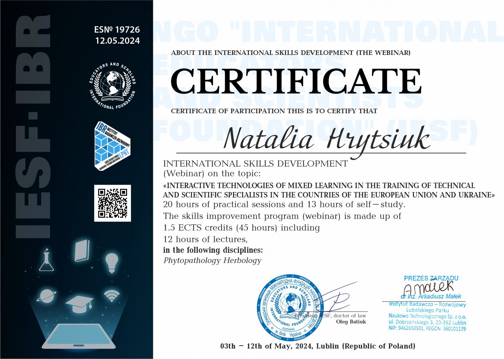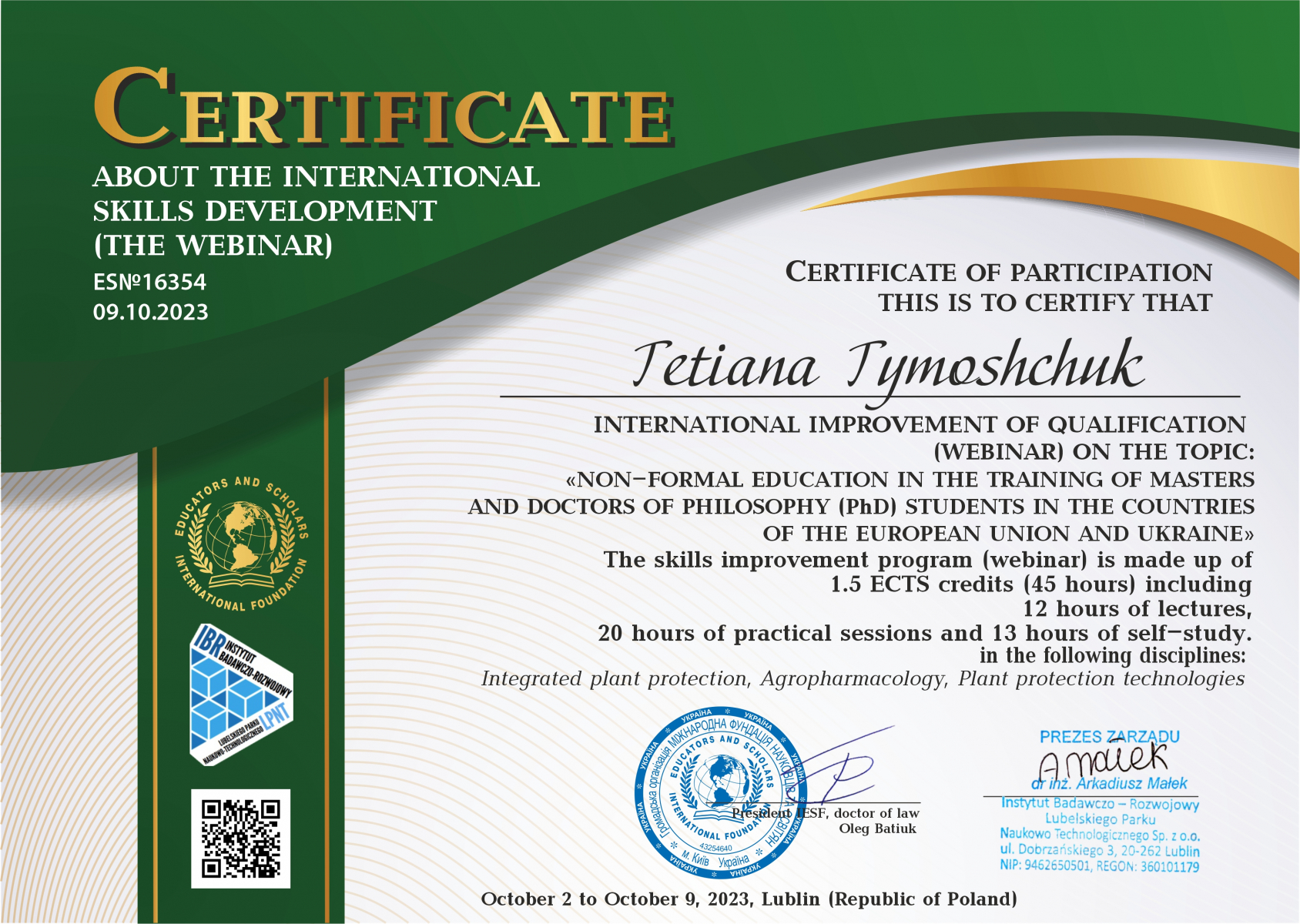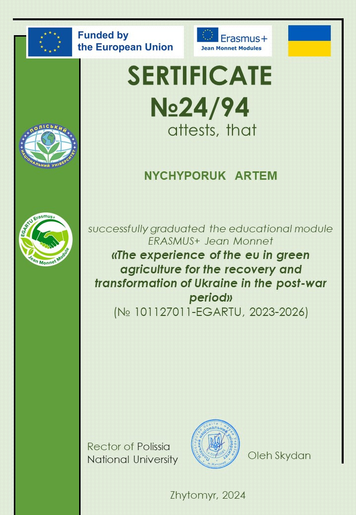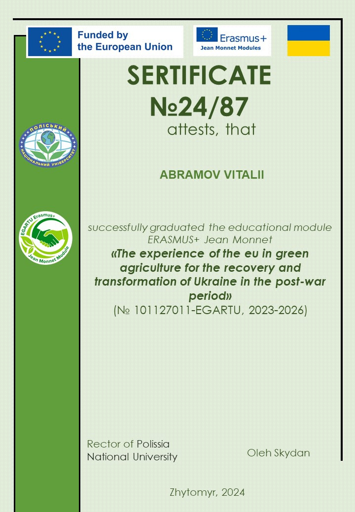 Здобувачі вищої освіти ОП «Захист і карантин рослин» у 2024 та 2025 рр. пройшли навчання з освітнього модулю ERASMUS+ Jean Monnet «Досвід ЄС у зеленому сільському господарстві для відновлення та трансформації України у повоєнний період».