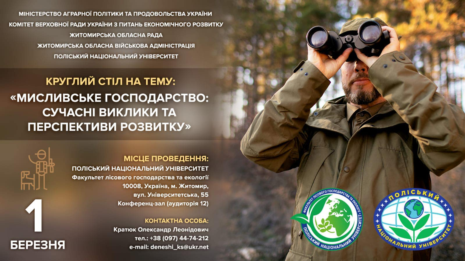 У перший день весни факультет лісового господарства та екології Поліського національного університету провів круглий стіл на тему: «Мисливське господарство: сучасні виклики та перспективи розвитку». Участь у заході взяли народний депутат України Ігор Марчук, ректор Поліського національного університету Олег Скидан, директор Малинського фахового коледжу Ігор Іванюк, голова НТР Всеукраїнської асоціації мисливців та користувачів мисливських угідь Василь Новицький, експерт зі здоровʼя тварин ФАО Олександр Ревнівцев, керівник наукової групи дослідження мисливських ресурсів України Віталій Смаголь, головний мисливствознавець ДП «Ліси України» Павло Маціборук, керівник навчально-наукового центру екології та охорони навколишнього середовища Поліського університету Тетяна Федонюк, а також науковці факультету та виробничники. На засіданні було заслухано змістовні доповіді щодо практичних аспектів діяльності Всеукраїнської асоціації мисливців; захворювань мисливської фауни в умовах війни; протиріччя у практиці ведення мисливського господарства та про хід виконання програми «Поліський вовк».https://www.facebook.com/groups/1506454322998205/posts/3466568996986718/