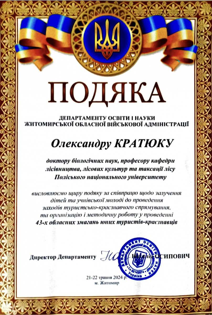 Професор кафедри лісового та садово-паркового господарства Олександр КРАТЮК суддя 44-ті змагання юних туристів-краєзнавців, організовані Центром позашкільної освіти для дітей та молоді Житомирської обласної ради. Цей щорічний захід об’єднує школярів, які захоплюються природою та історією рідного краю. https://surl.li/tqbgyb