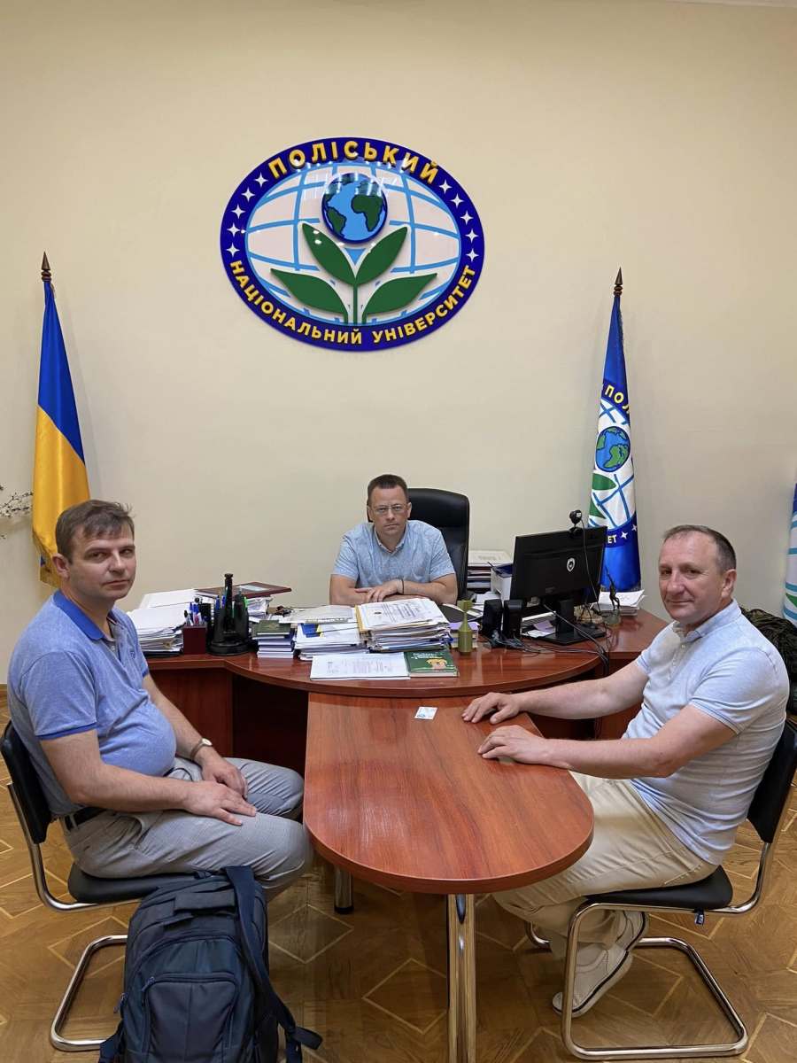 Робоча зустріч науковців факультету лісового господарства та екології Поліського національного університету з менеджером з інноваційного розвитку ДП «Ліси України» Петром Лакидою та начальником відділу екосистемних послуг, побічного лісокористування та рекреації ДП «Ліси України» Юрієм Несторяком. Обговорили шляхи реалізації наукових проектів згідно укладених договорів №21-1/21.06.2024-з «Теоретичні засади та практичні рекомендації вирощування модрини європейської у деревостанах Житомирського Полісся в умовах змін клімату» та №21-2/21.06.2024-з «Розробка рекомендацій щодо організації заходів протипожежного впорядкування лісів: створення та розташування рекреаційних пунктів і їх кількості; лісових доріг; протипожежних барʼєрів; розривів; мінералізованих смуг. Сьогодні Поліський національний університет налагоджує тісну та довготривалу співпрацю в науковій сфері з ДП «Ліси України». https://surl.li/gziqxr