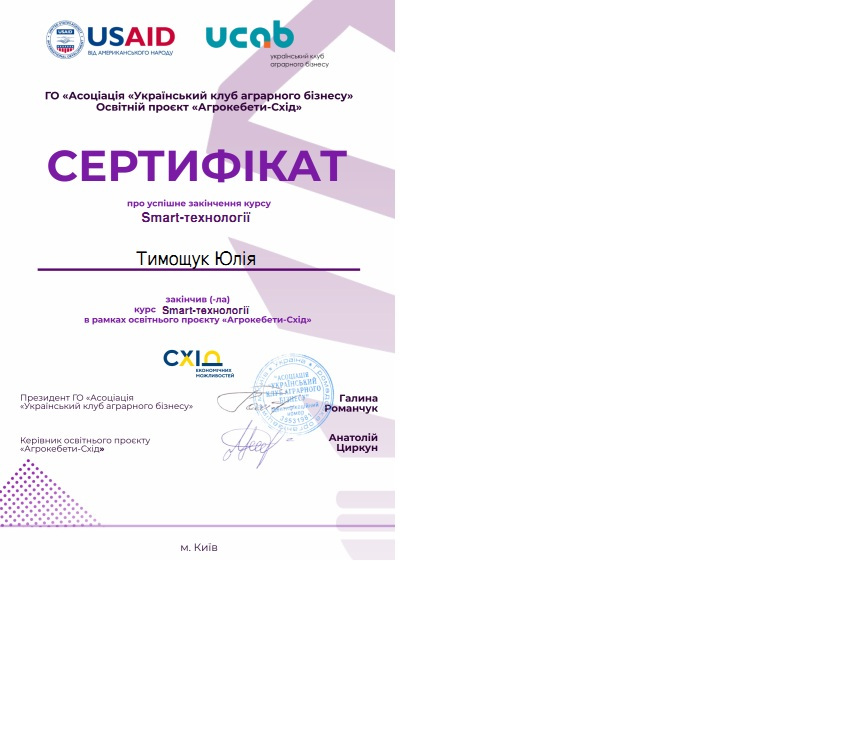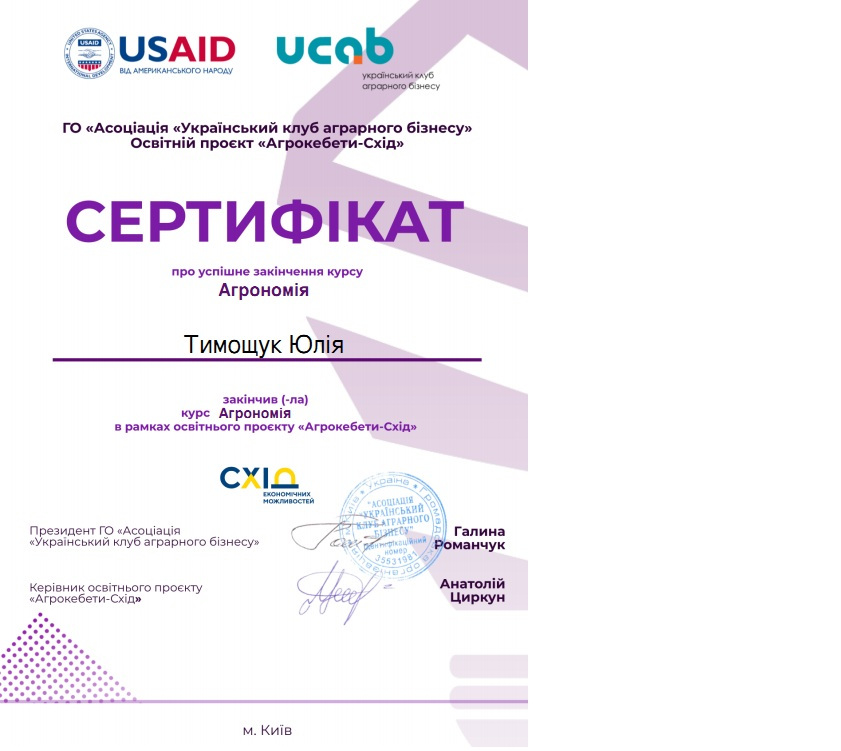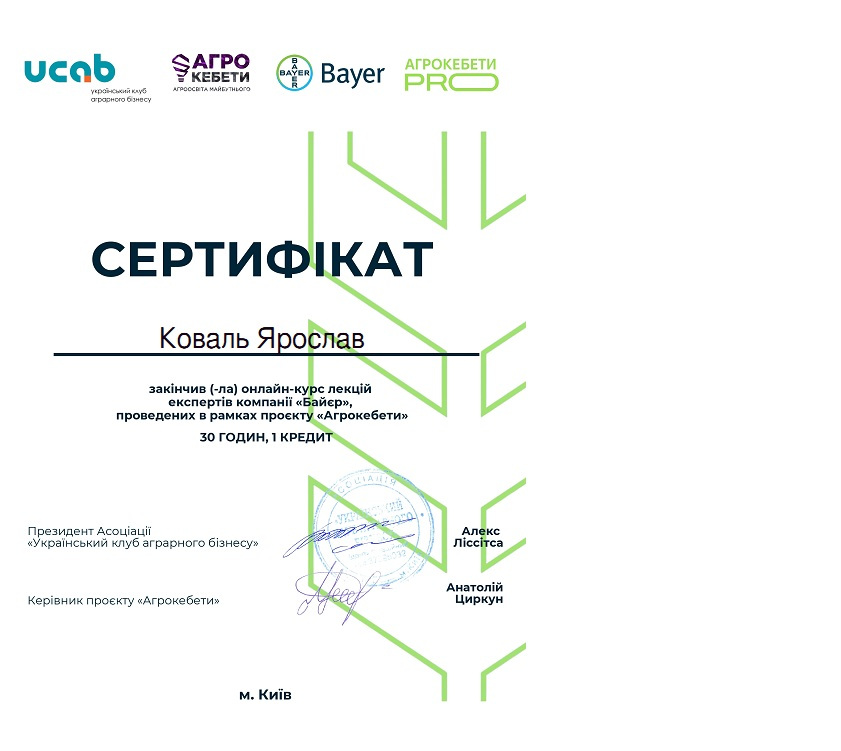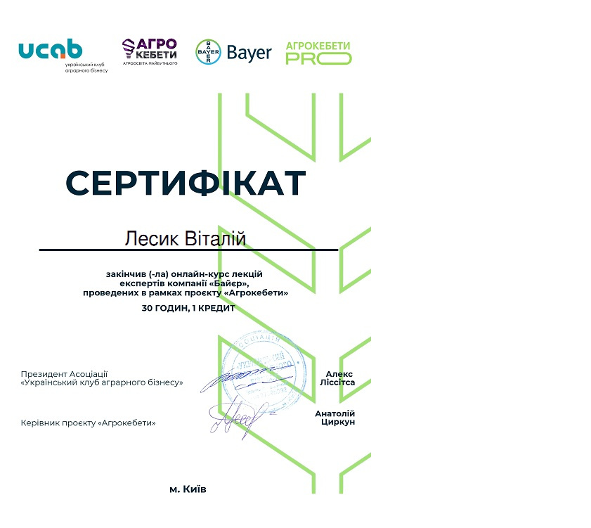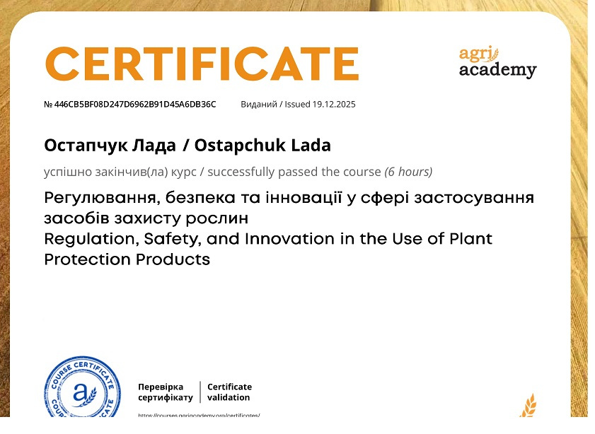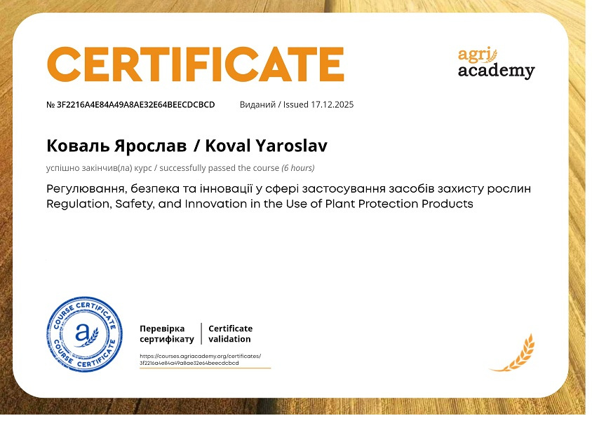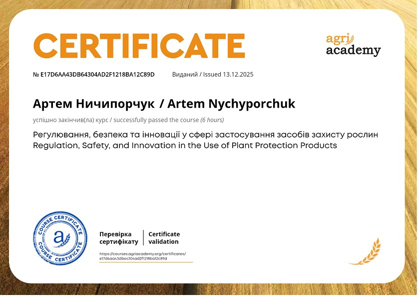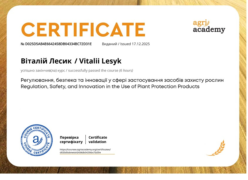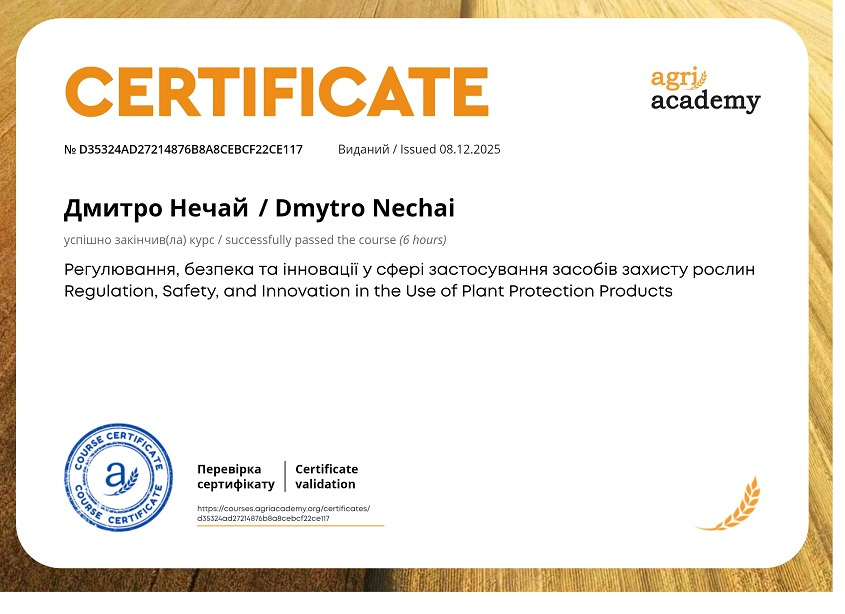 Онлайн-курс «Регулювання, безпека та інновації у сфері застосування засобів захисту рослин», що організований на навчальній платформі «Agriacademy». Зарахування тем з курсу «Хімічний захист рослин з основами агротоксикології».