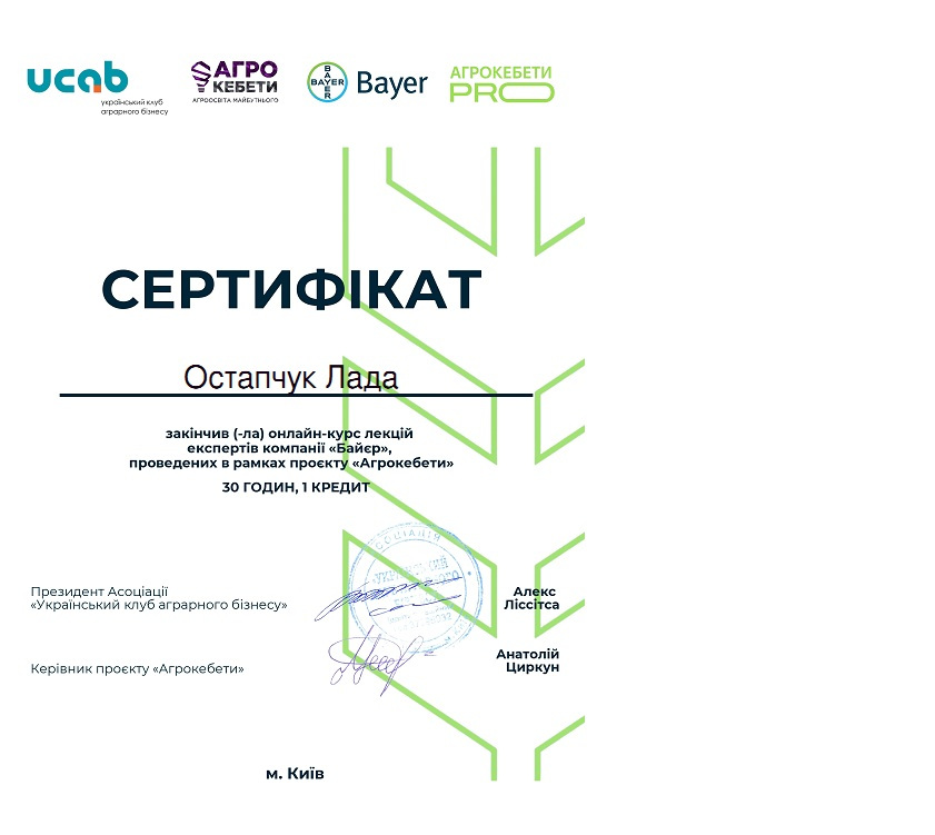 Онлайн-курс лекцій від експертів компанії «Байєр» на навчальній платформі «АгрокебетиPRO». Зарахування тем з курсу «Хімічний захист рослин з основами агротоксикології».