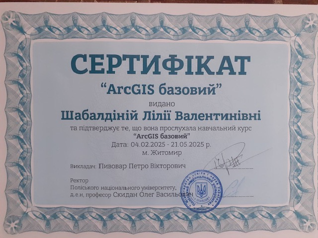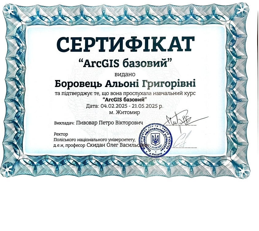 Курс «ArcGis базовий» що організований у Поліському національному університеті. Зарахування тем з курсу «ГІС технології в захисті рослин».