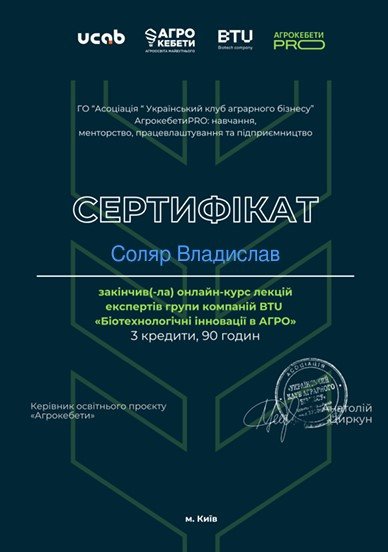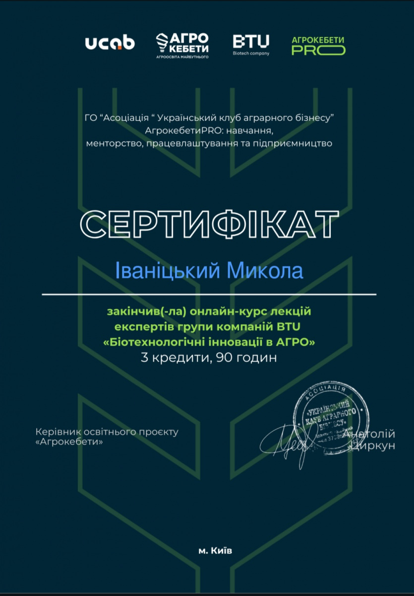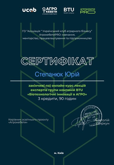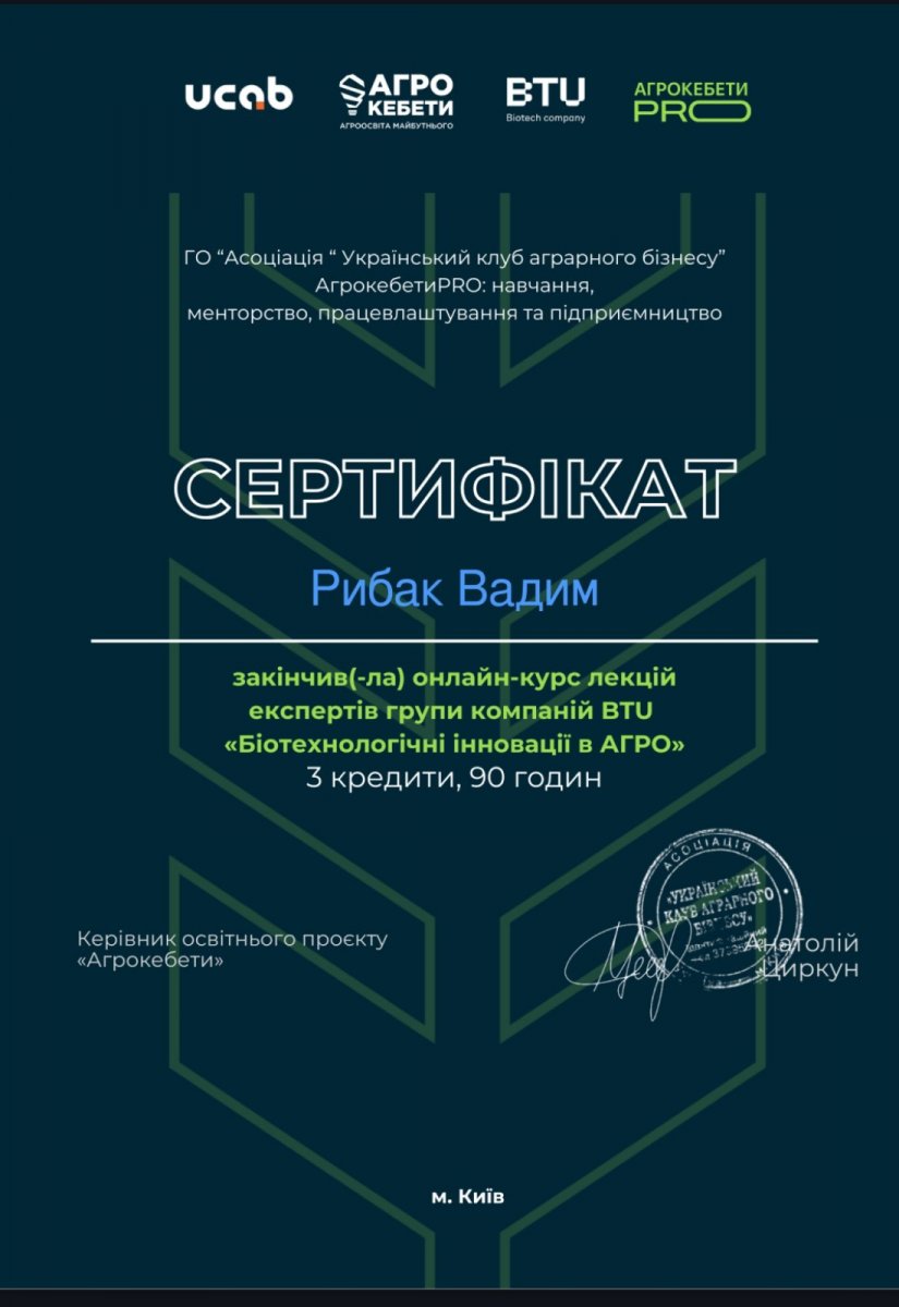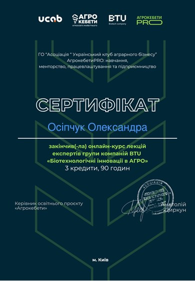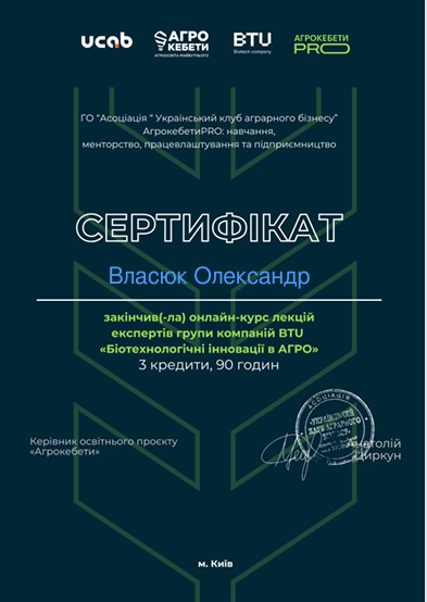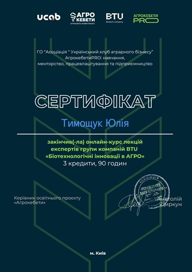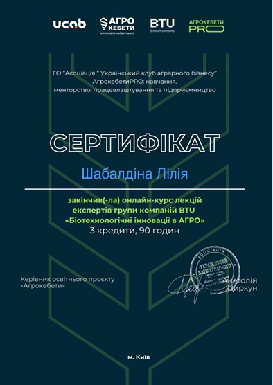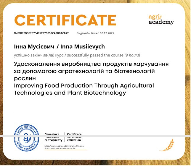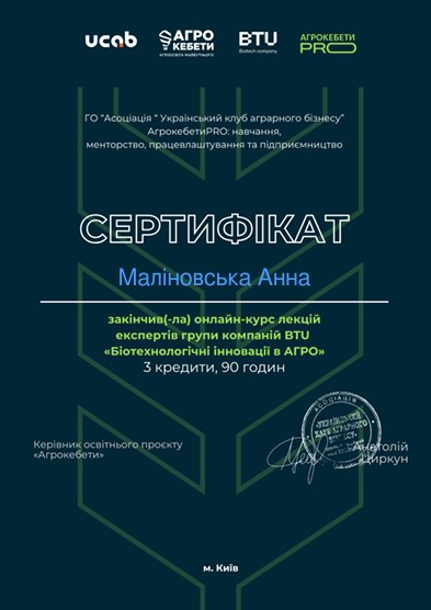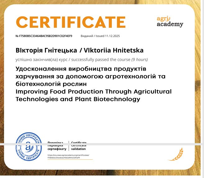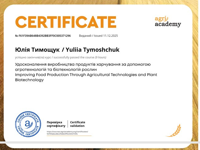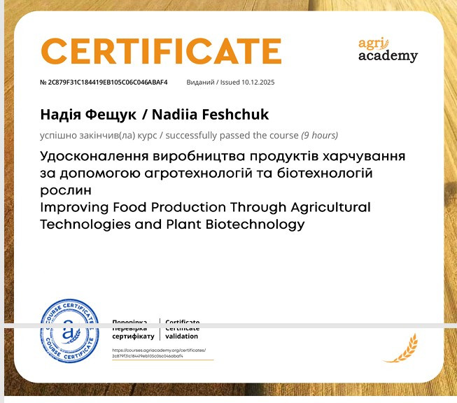 Онлайн-курс «Удосконалення виробництва продуктів харчування за допомогою агротехнологій та біотехнологій рослин», що організований на навчальній платформі «Agriacademy». Зарахування тем з курсу «Основи біотехнології в захисті рослин».