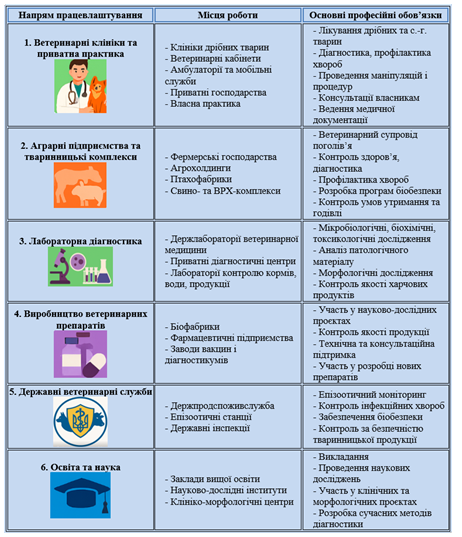 Завдяки якісній професійній підготовці, орієнтації на потреби ринку та тісній співпраці з роботодавцями випускники ОПП «Ветеринарна медицина» мають можливість реалізувати себе в різних сферах ветеринарної галузі. Широкий спектр напрямів діяльності дає їм змогу обирати професійний шлях відповідно до власних інтересів, компетентностей та перспектив подальшого розвитку. Отримані під час навчання знання й практичні навички забезпечують високу готовність випускників до роботи в умовах різних форм ветеринарної практики – від клінічної діяльності до лабораторної діагностики та державного ветеринарного контролю.