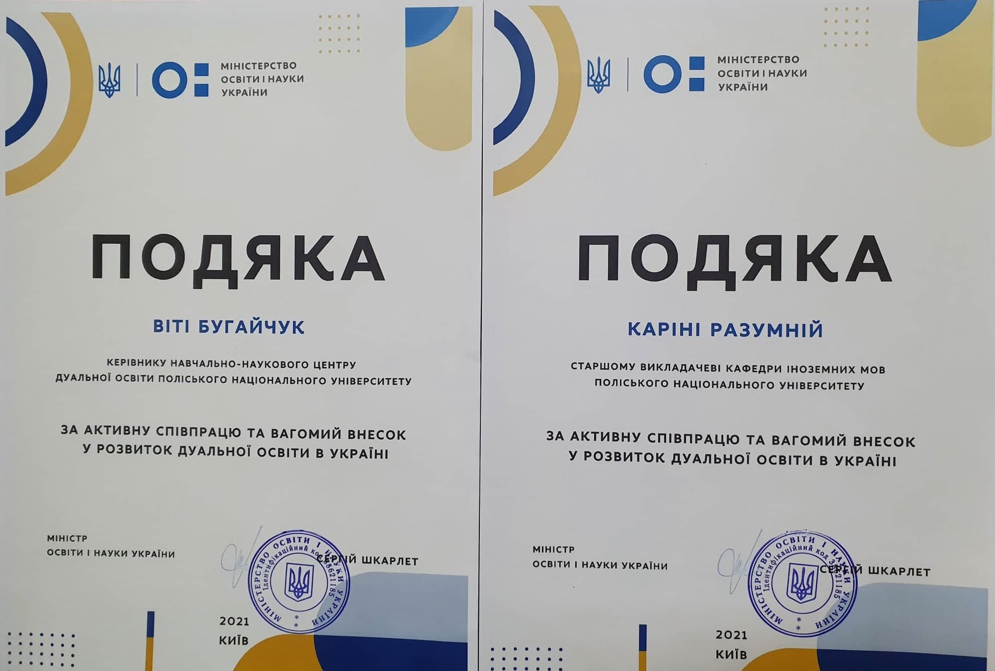 Подяки за активну співпрацю та вагомий внесок  у розвиток дуальної освіти в Україні від Міністра освіти і науки Сергія Шкарлета отримали викладачі Поліського національного університету.