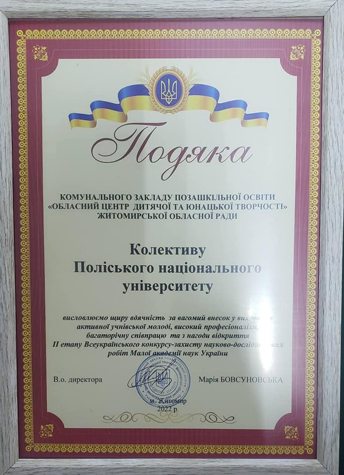 Науковці Поліського національного університету були відзначені подякою КЗПО «Обласний Центр дитячої та юнацької творчості» Житомирської обласної ради за багаторічну співпрацю та вагомий внесок у виховання активної учнівської молоді.