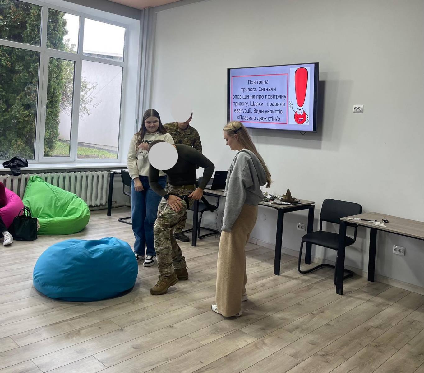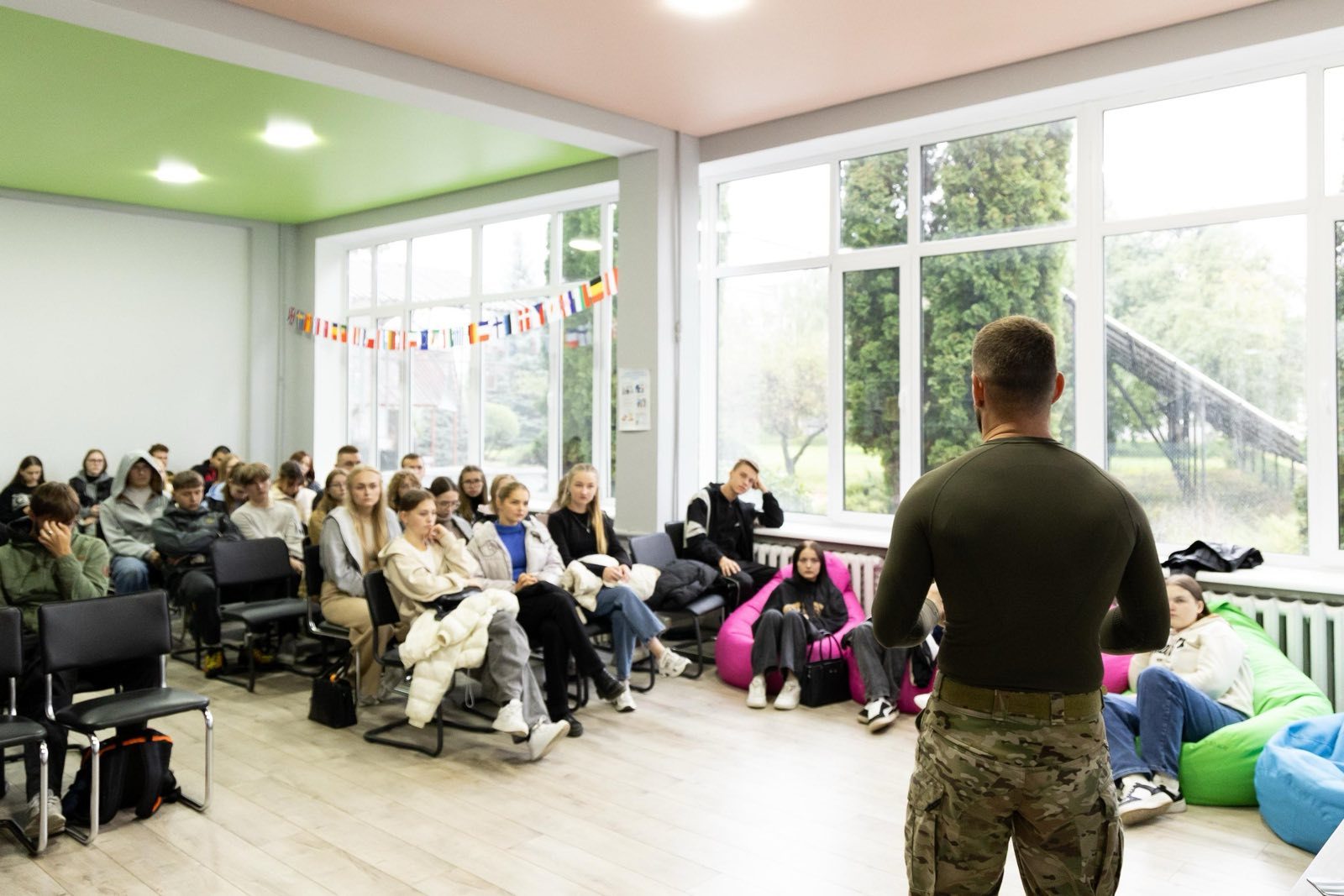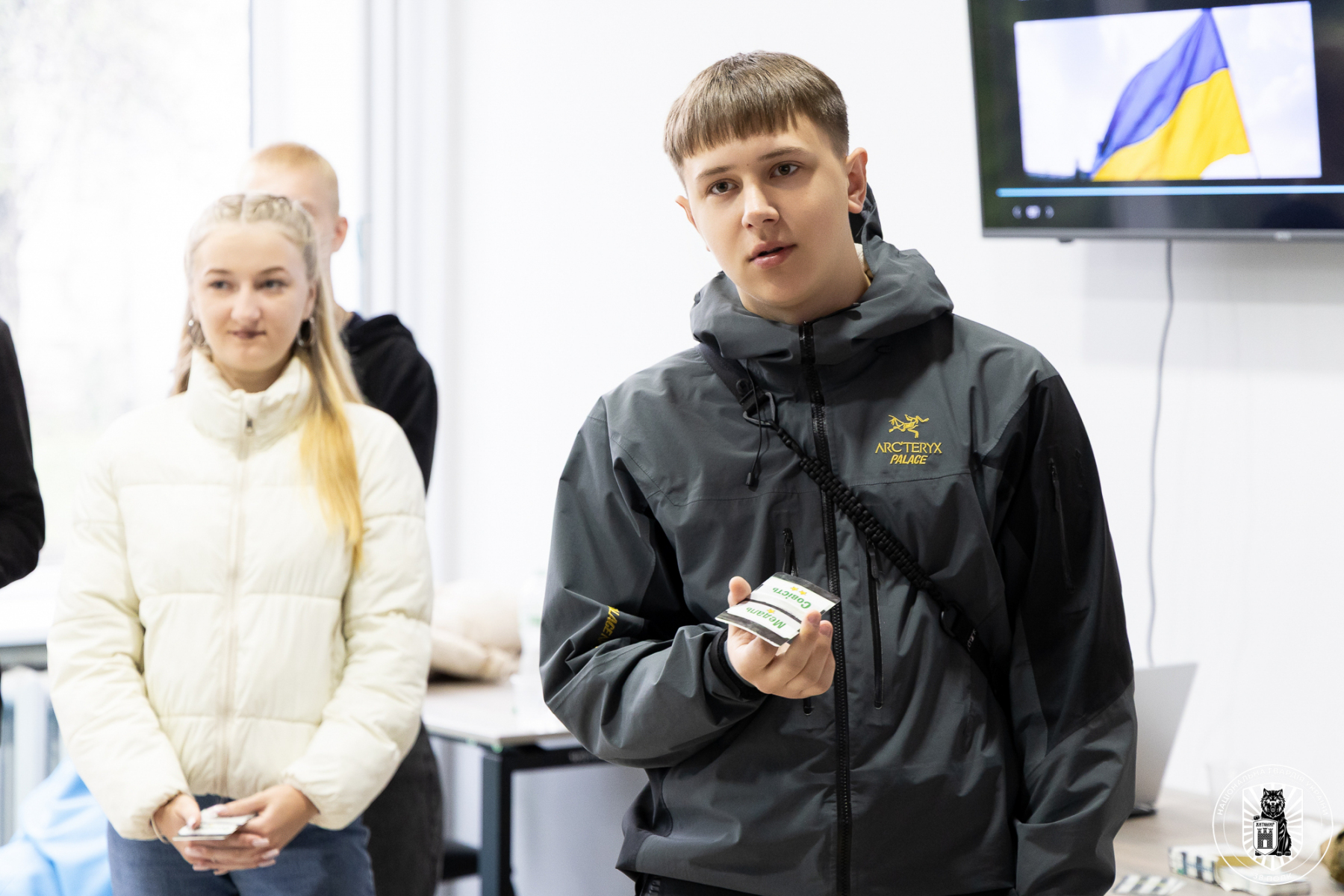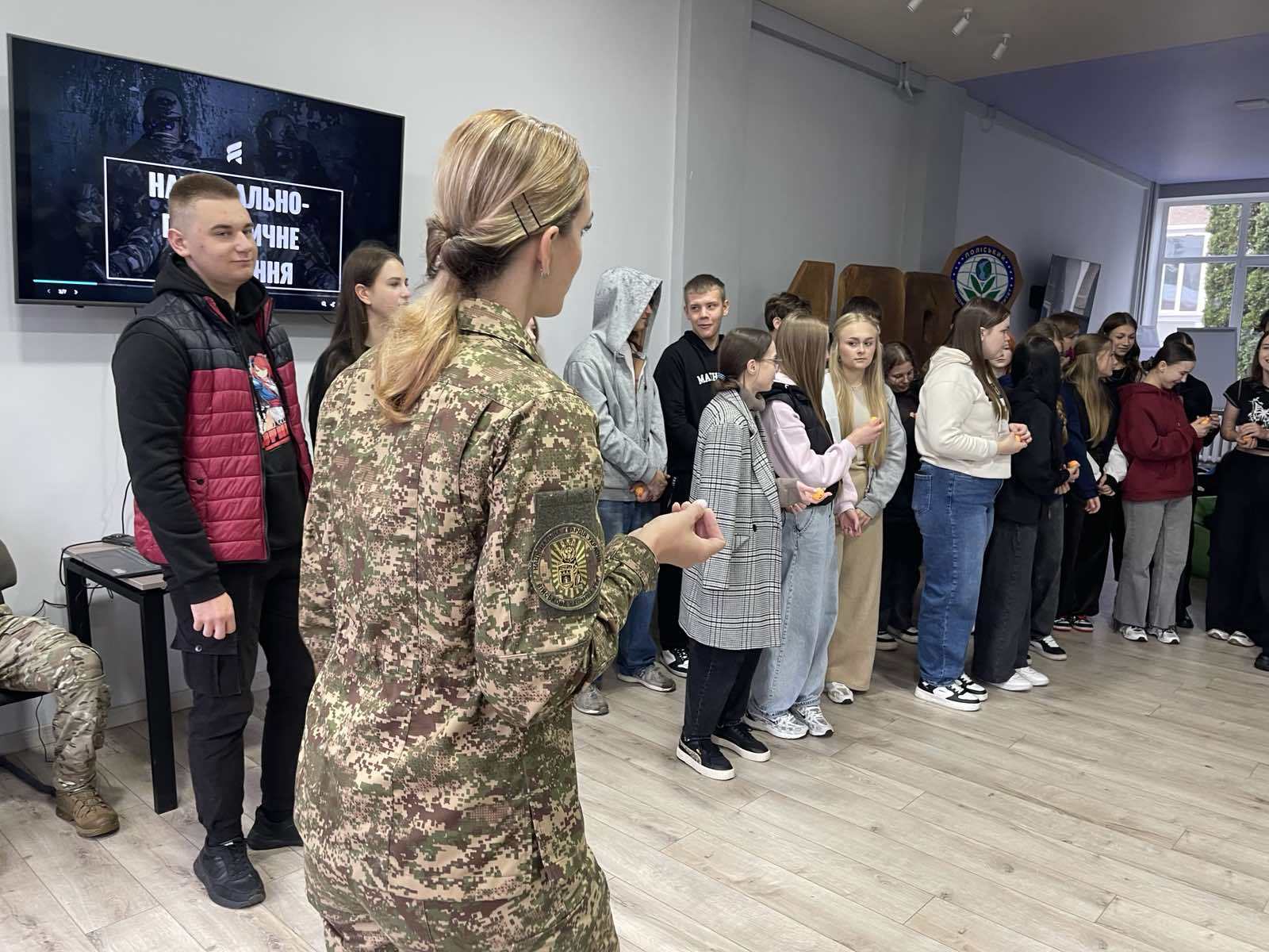 До студентів завітали військовослужбовці 38-го полку Національної гвардії України. Офіцер полку провів інтерактивну зустріч зі студентами, де говорили про патріотизм, відповідальність і силу єдності. Інструктор з тактичної медицини показав, як правильно накладати турнікет і зупиняти кровотечу – студенти не просто слухали, а пробували все на практиці.