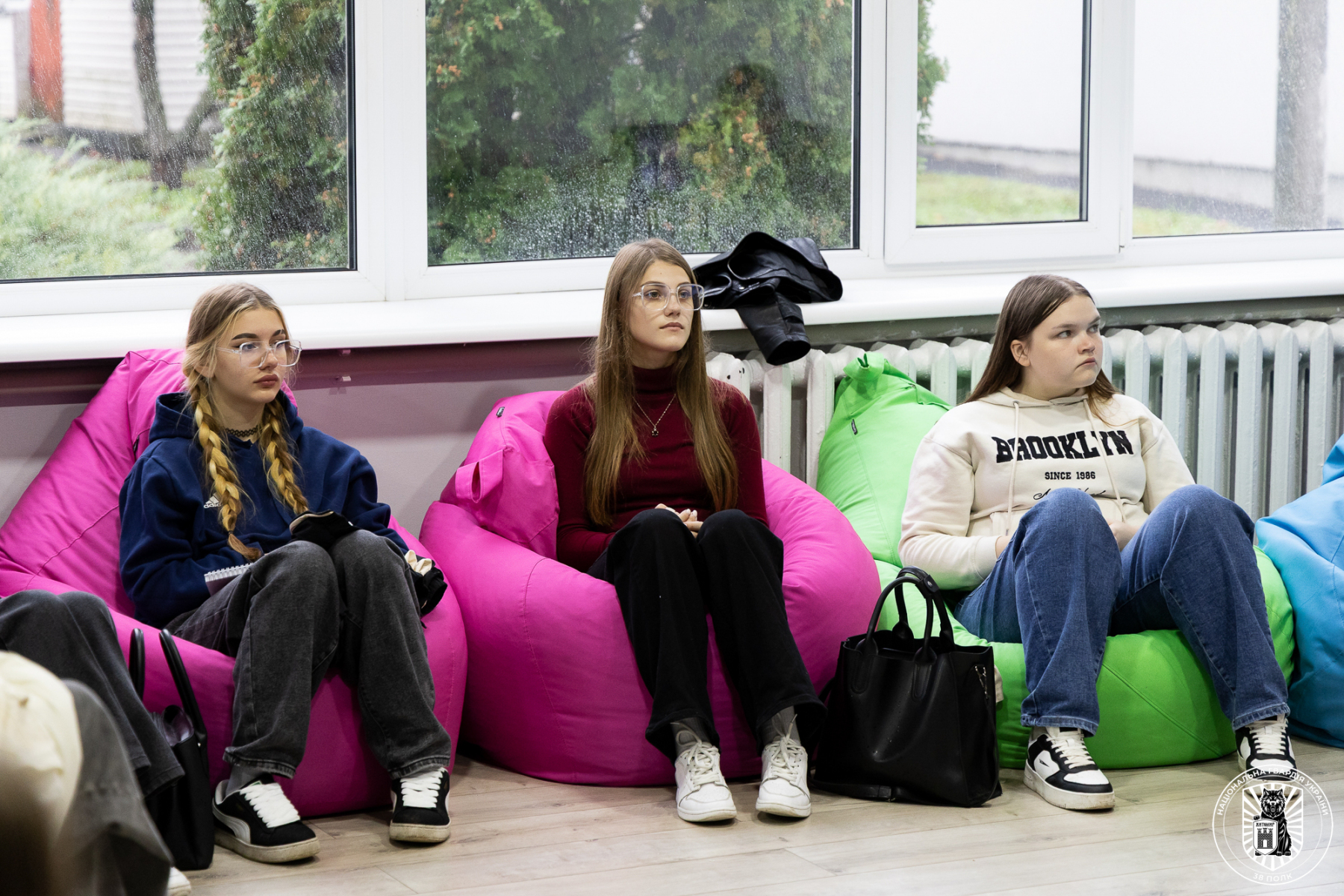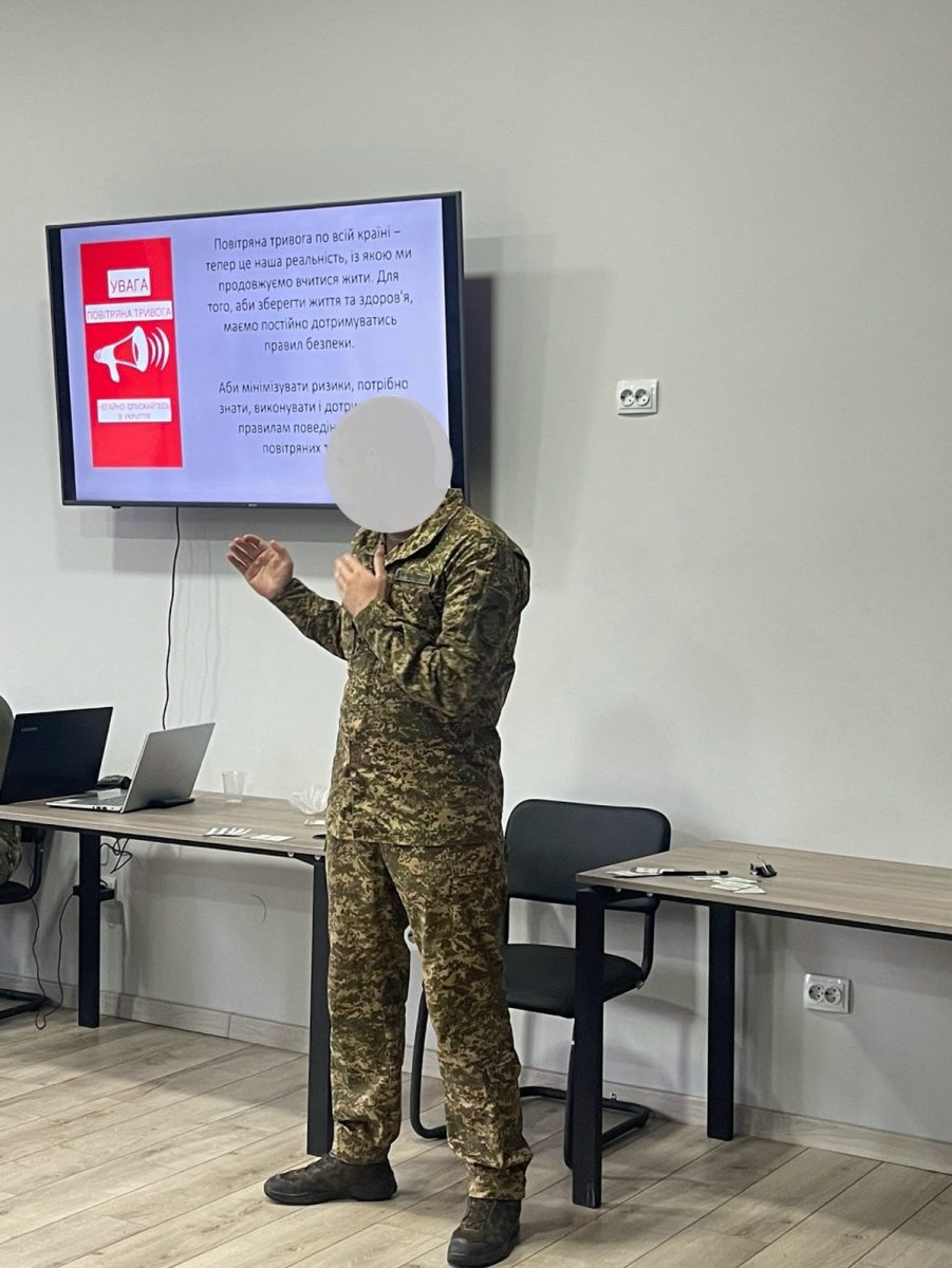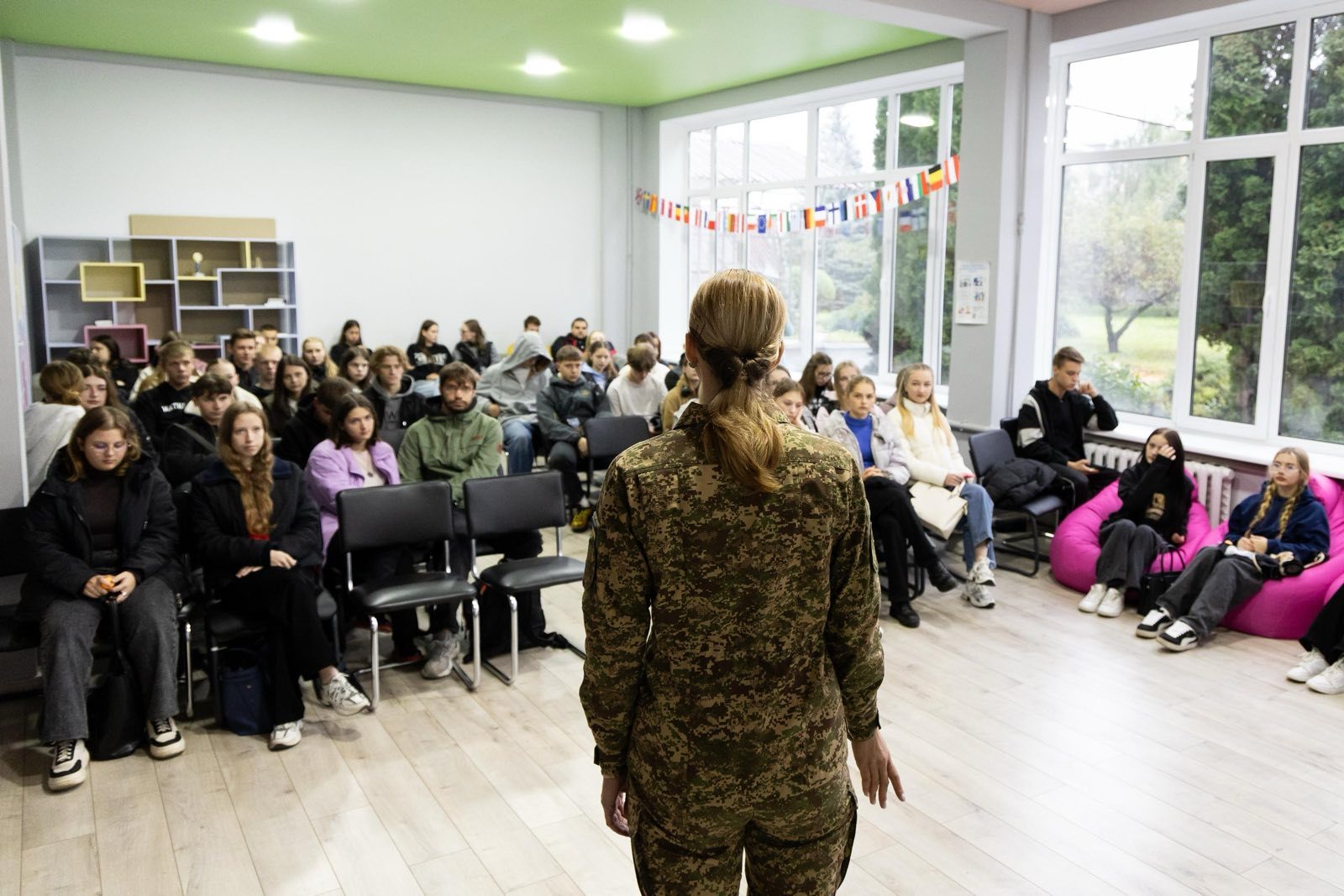 До студентів завітали військовослужбовці 38-го полку Національної гвардії України. Офіцер полку провів інтерактивну зустріч зі студентами, де говорили про патріотизм, відповідальність і силу єдності. Інструктор з тактичної медицини показав, як правильно накладати турнікет і зупиняти кровотечу – студенти не просто слухали, а пробували все на практиці.