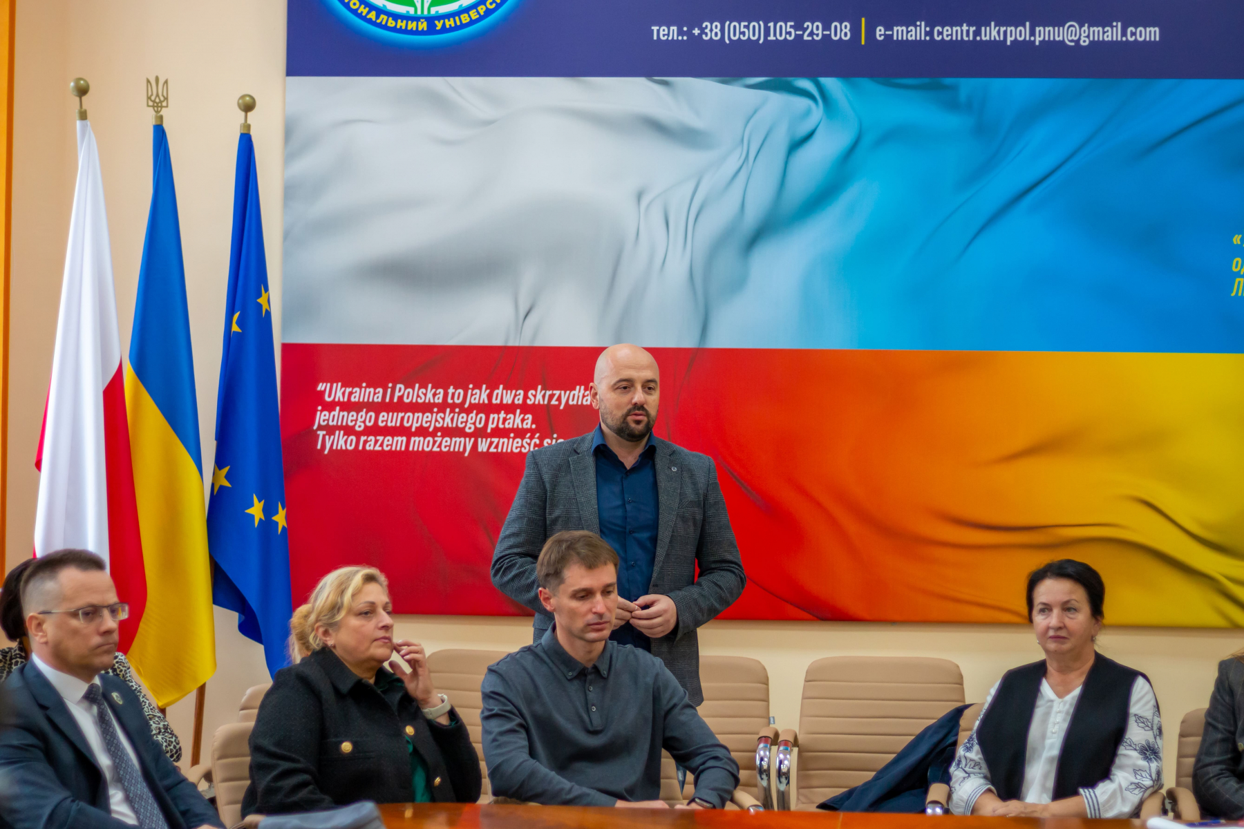 Проректор  з науково-педагогічної роботи, соціального та гуманітарного розвитку Поліського національного університету Іван Мартинчук акцентував увагу, що у Центрі українсько-польського співробітництва зібрано  колекцію видань польською мовою, в яких йдеться про минуле і сучасне Польщі, завдяки чому студенти та відвідувачі зможуть для себе дізнатися більше про цю країну. Крім цього, він нагадав, що упродовж 5 місяців в 2022 році на базі Поліського національного університету діяв Гуманітарний штаб, який надавав допомогу ТРО та військовим підрозділам, медичним закладам, рятувальникам, громадам, які приймали ВПО. Все це стало можливим завдяки регулярним вантажам з Польщі, які допомагав збирати разом з партнерами та доставляти у Житомир Володимир Дурава  – голова правління та засновник групи компаній «ITM Industry Group».