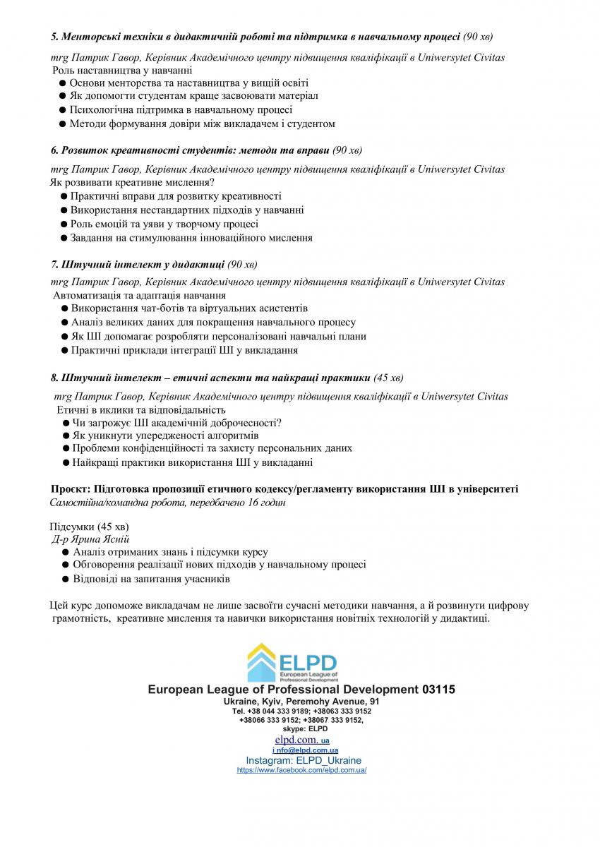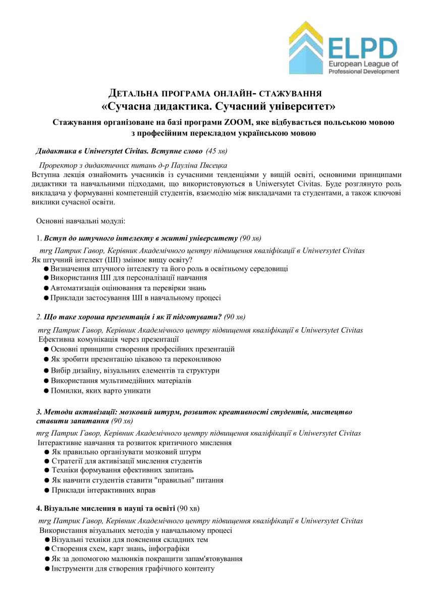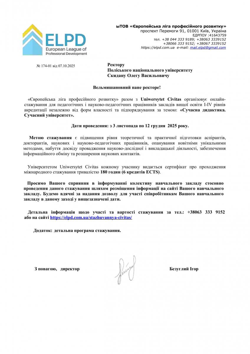 Європейська ліга професійного розвитку (ELPD) спільно з Uniwersytet Civitas організовує з 3 листопада по 12 грудня 2025 року міжнародне науково-педагогічне онлайн-стажування за темою: «Сучасна дидактика. Сучасний університет».