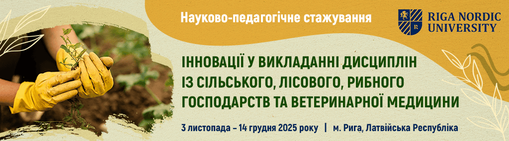 Шановні колеги,  Ризький північний університет  (м. Рига,  Латвійська Республіка)  запрошує пройти  стажування  з  03 листопада 2025 року по 14 грудня 2025 року  за темою: ІННОВАЦІЇ У ВИКЛАДАННІ ДИСЦИПЛІН ІЗ СІЛЬСЬКОГО, ЛІСОВОГО, РИБНОГО ГОСПОДАРСТВ ТА ВЕТЕРИНАРНОЇ МЕДИЦИНИ.