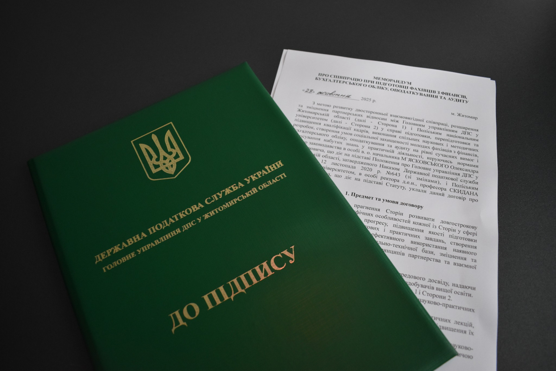 Встановлення та розвиток спільного освітнього та професійного партнерства, консолідація зусиль щодо обміну інформацією та досвідом, а також участь та проведення спільних заходів – це одні з головних пунктів Меморандуму про співпрацю, який 23 жовтня підписали ректор Поліського національного університету Олег Скидан та очільник Головного управління Державної податкової служби у Житомирській області Олександр М`ясковський.