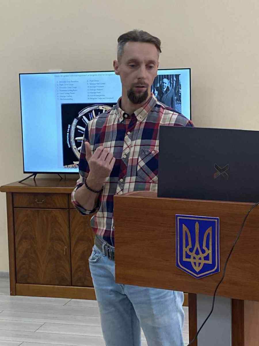 Лектор-модератор заходу розповів студентам основні базові принципи регенеративного землеробства, проблеми і виклики, які виникають у фермерів під час ведення аграрного бізнесу та шляхи їх вирішення.