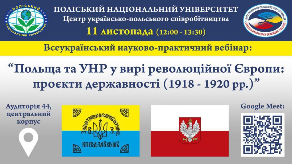 У вівторок, 11-го листопада 2025 року на базі Центру українсько-польського співробітництва Поліського національного університету о 12.00-13.30 год. у змішаному форматі відбудеться Всеукраїнському науково-практичний вебінар на тему: «Польща та УНР у вирі революційної Європи: проєкти державності (1918-1920 рр.)», присвячений 107-ій річниці здобуття незалежності Республіки Польщі та реалізації українського державотворчого процесу в УНР у 20-х рр. ХХ ст.