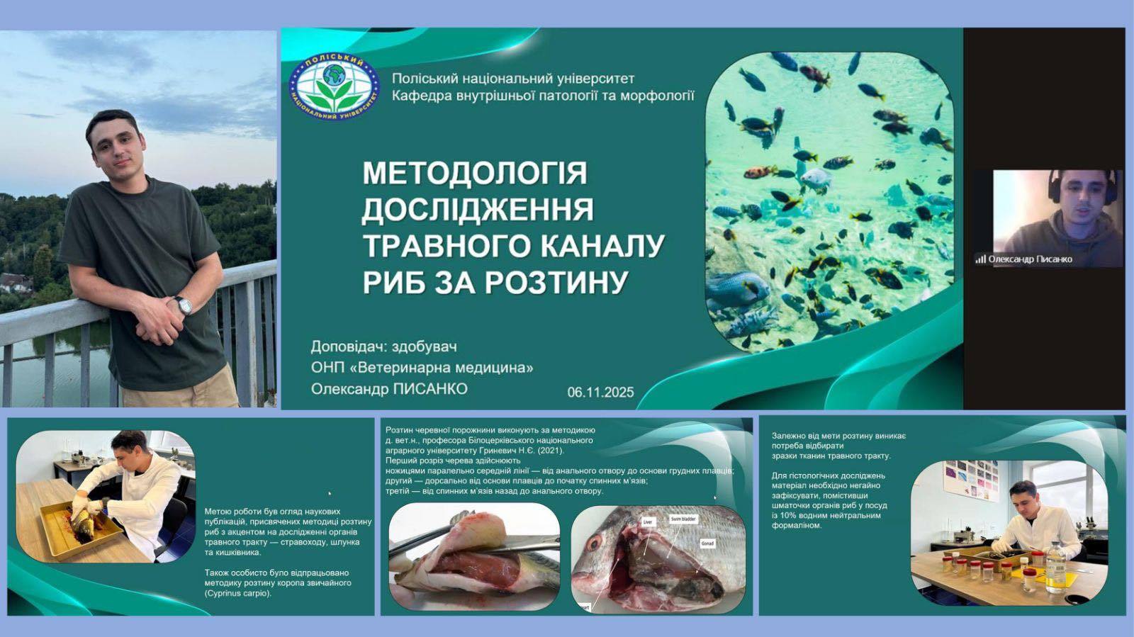 У цьому заході взяли участь молоді науковці з 13 закладів вищої освіти України. Зокрема, Поліський національний університет представив здобувач освітньо-наукової програми «Ветеринарна медицина» факультету ветеринарної медицини та тваринництва Олександр Писанко, який виступив із доповіддю «Методологія дослідження травного каналу риб під час розтину».