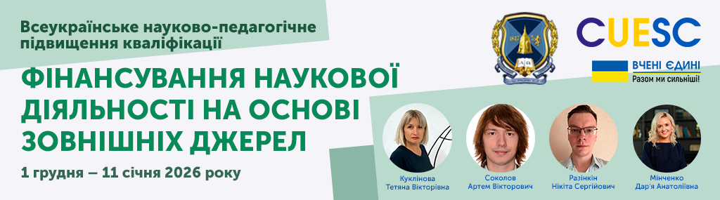 Національний університет «Одеська юридична академія», Центр українсько-європейського наукового співробітництва запрошують узяти участь у всеукраїнському науково-педагогічному підвищенні кваліфікації «Фінансування наукової діяльності на основі зовнішніх джерел», яке відбудеться 1 грудня – 11 січня 2026 року.