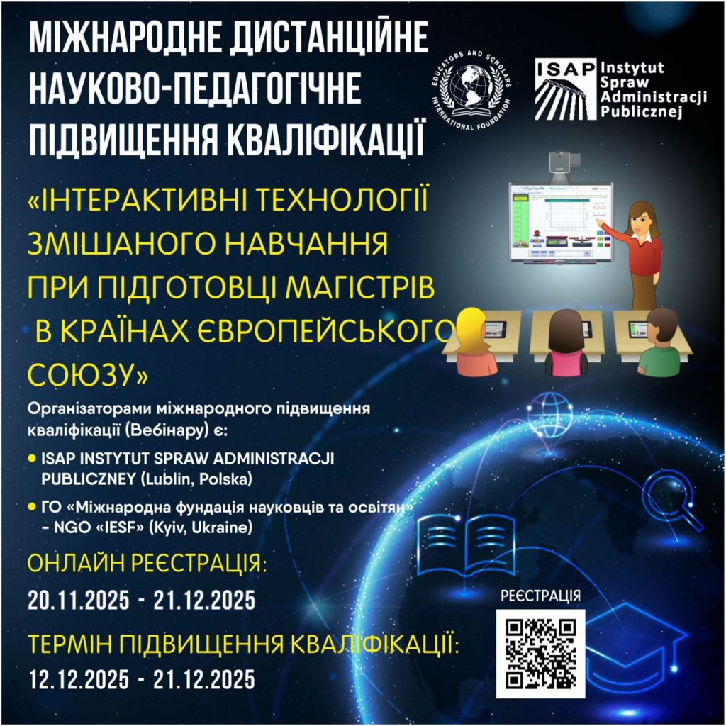 Шановні колеги, Інститут справ адміністрації публічної ISAP (м. Люблін, Республіка Польща) та Міжнародна фундація науковців та освітян – IESF запрошують пройти з 12 грудня 2025 року по 21 грудня 2025 року міжнародне дистанційне науково-педагогічне підвищення кваліфікації на тему: «IНТЕРАКТИВНІ ТЕХНОЛОГІЇ ЗМІШАНОГО НАВЧАННЯ ПРИ ПІДГОТОВЦІ МАГІСТРІВ  В КРАЇНАХ ЄВРОПЕЙСЬКОГО СОЮЗУ».