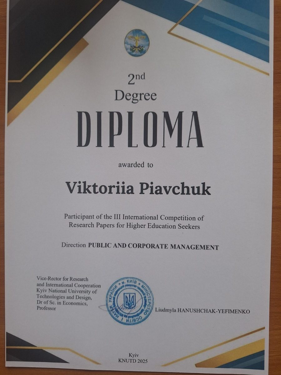 Студентка Поліського національного університету Вікторія П’явчук виборола диплом ІІ ступеня у ІІІ Міжнародному конкурсі наукових робіт здобувачів вищої освіти. Науковий керівник – завідувач кафедри економіки, підприємництва та туризму Поліського національного університету Наталія Валінкевич.