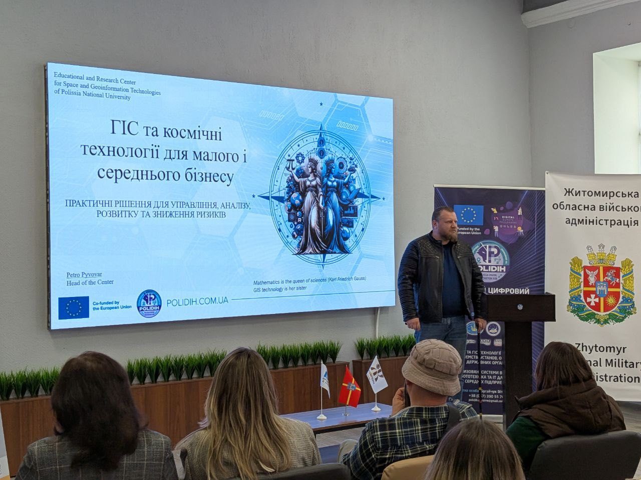 У своїй доповіді спікери – керівник Навчально-наукового центру космічних та геоінформаційних технологій університету Петро Пивовар та його заступник Олександр Рожков,   розповіли про сучасні підходи до аналізу просторових даних, зокрема використання цифрових карт та аналітичних платформ для прийняття управлінських рішень у сфері малого та середнього підприємництва. Особливу увагу було приділено практичним кейсам застосування геоінформаційних систем для оптимізації виробничих процесів, логістики та розширення ринків збуту.